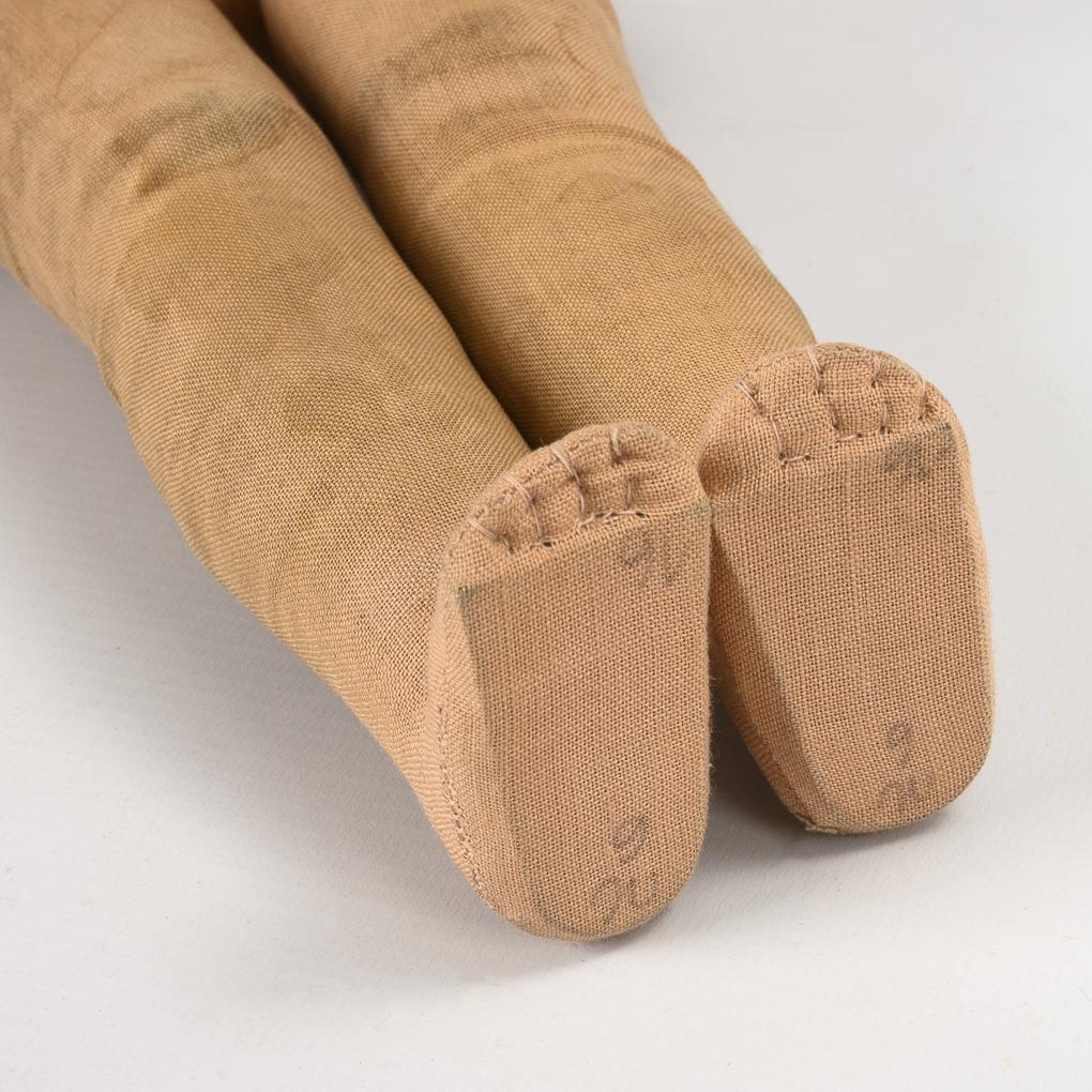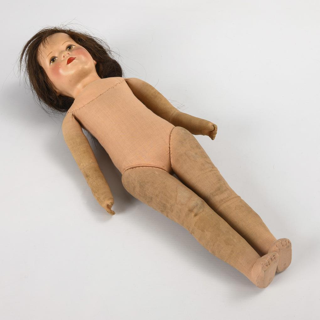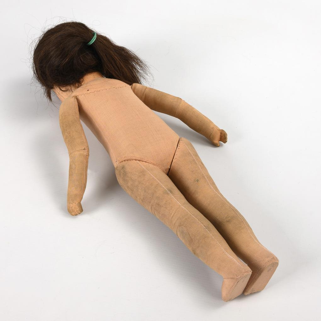 Type XIV. Turnable tortulon head, painted brown eyes, dark brown human hair wig. Slender fabric body with angled elbows. Short patterned dress, white plastic shoes. Tiny paint bumps on the face, dirty arms and legs.