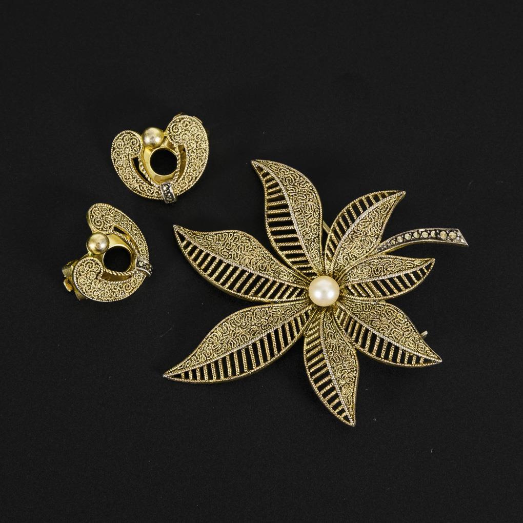 Filigree wire-decorated leaf brooch with cultured pearl and partial marcasite setting. Ball hook. Pair of ear clips with filigree decoration. Clip mechanism.