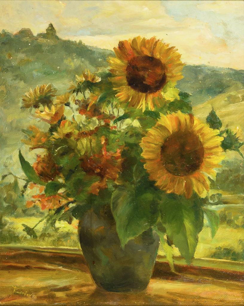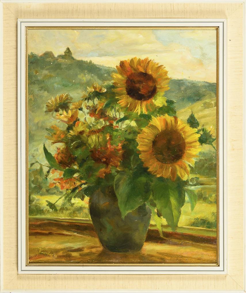 Bouquet of flowers with sunflowers in a vase with a view of the Wachsenburg. Traces of age.