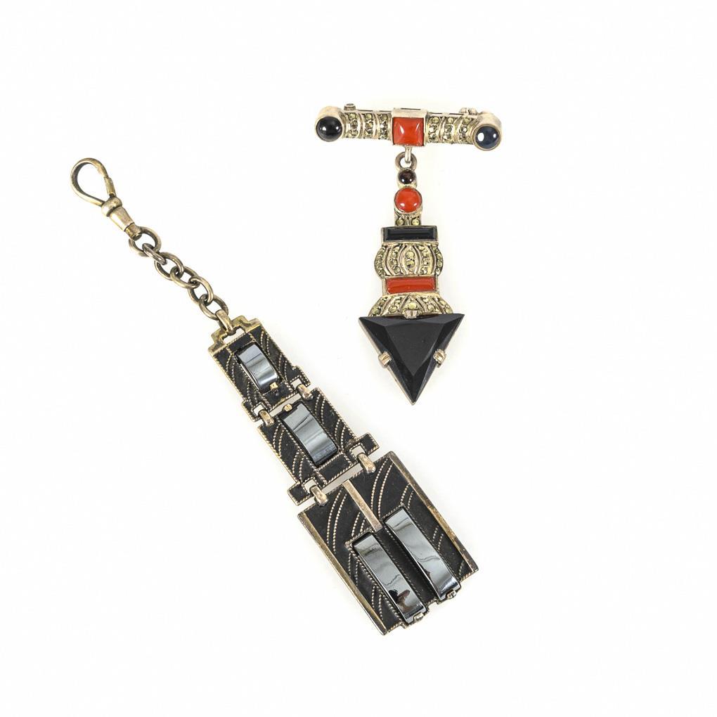 Links with matt enamel and hematite segments suspended from a lobster clasp. Marcasite-set brooch with onyx segments and coral inlays. Ball hook.