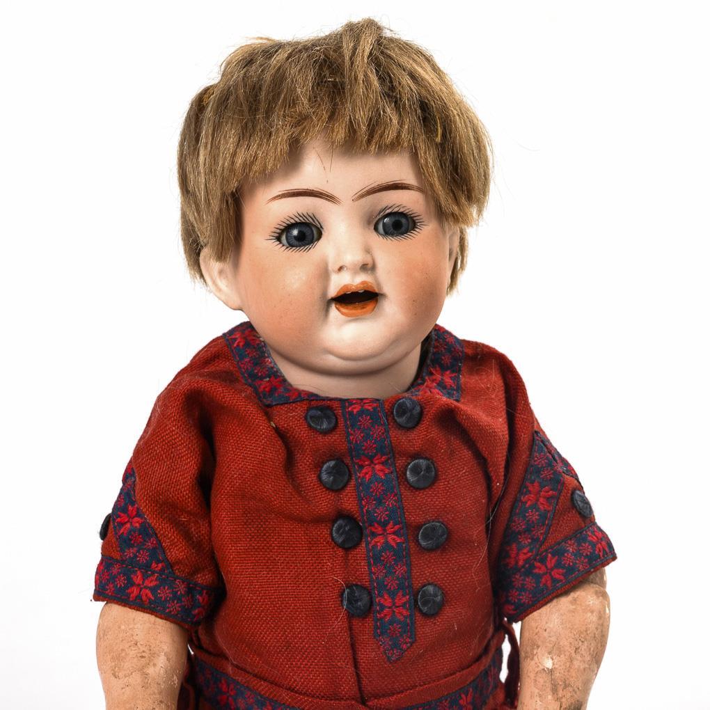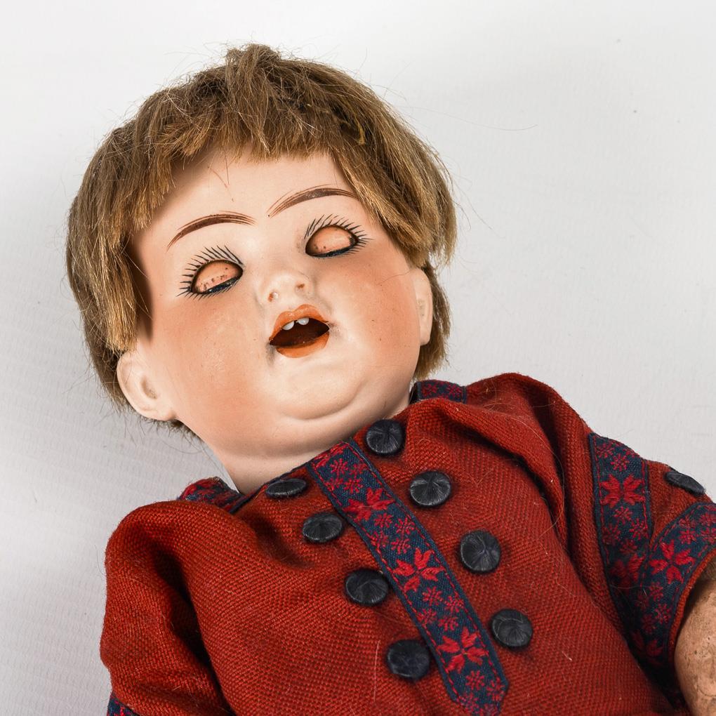 Cranked head, blue sleeping eyes, blond mohair wig. 13-part jointed body. Red smock, striped trousers, brown leather shoes. Head x-rayed: without defects, only minimal wig pull. Body with small color defects, 1 finger of the left hand missing.