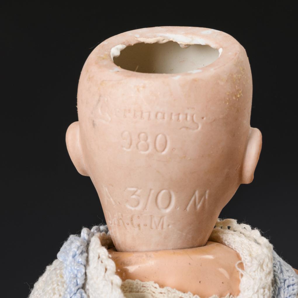 All with crank head, sleeping eyes and 5-part baby body (some with small knocks). Dreambaby (AM 351) with dark blue knitted trousers. Loose head, l 30 cm / Character baby (AM 980) with brown mohair wig and white baby clothes, l 28 cm. / Small blonde doll (Heubach 320) with white dress. Chip on left eye, 2 fingers missing, l 29 cm.