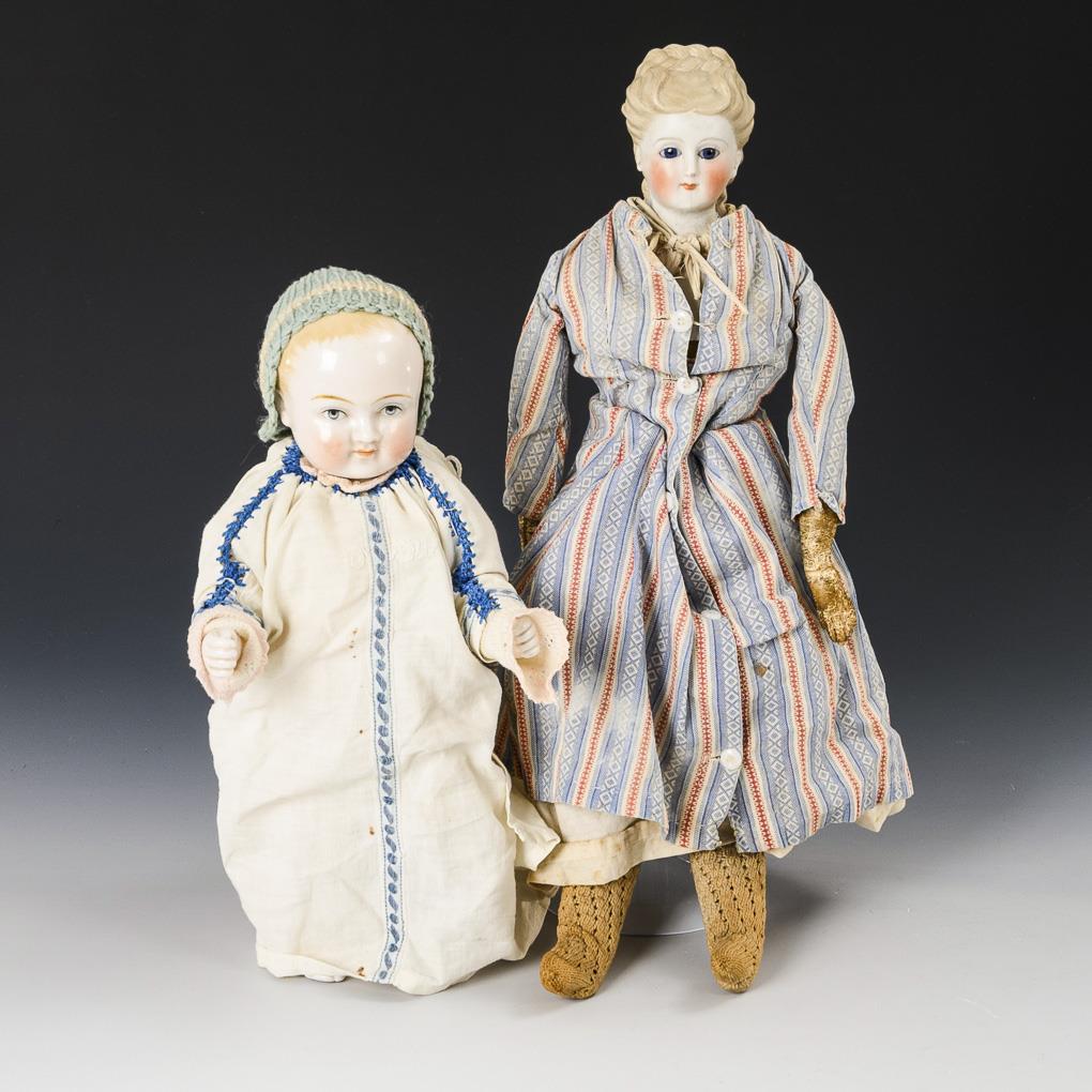 Doll lady with a light bisque porcelain head, blue glass eyes, molded hair, fabric body and leather arms. Blue dress with red stripes. Breast head with defects and repairs. L 42 cm. / Bathing doll made of pink tinted porcelain, with painted blue eyes and blond hair. White nightgown, blue knitted cap. L 29 cm.