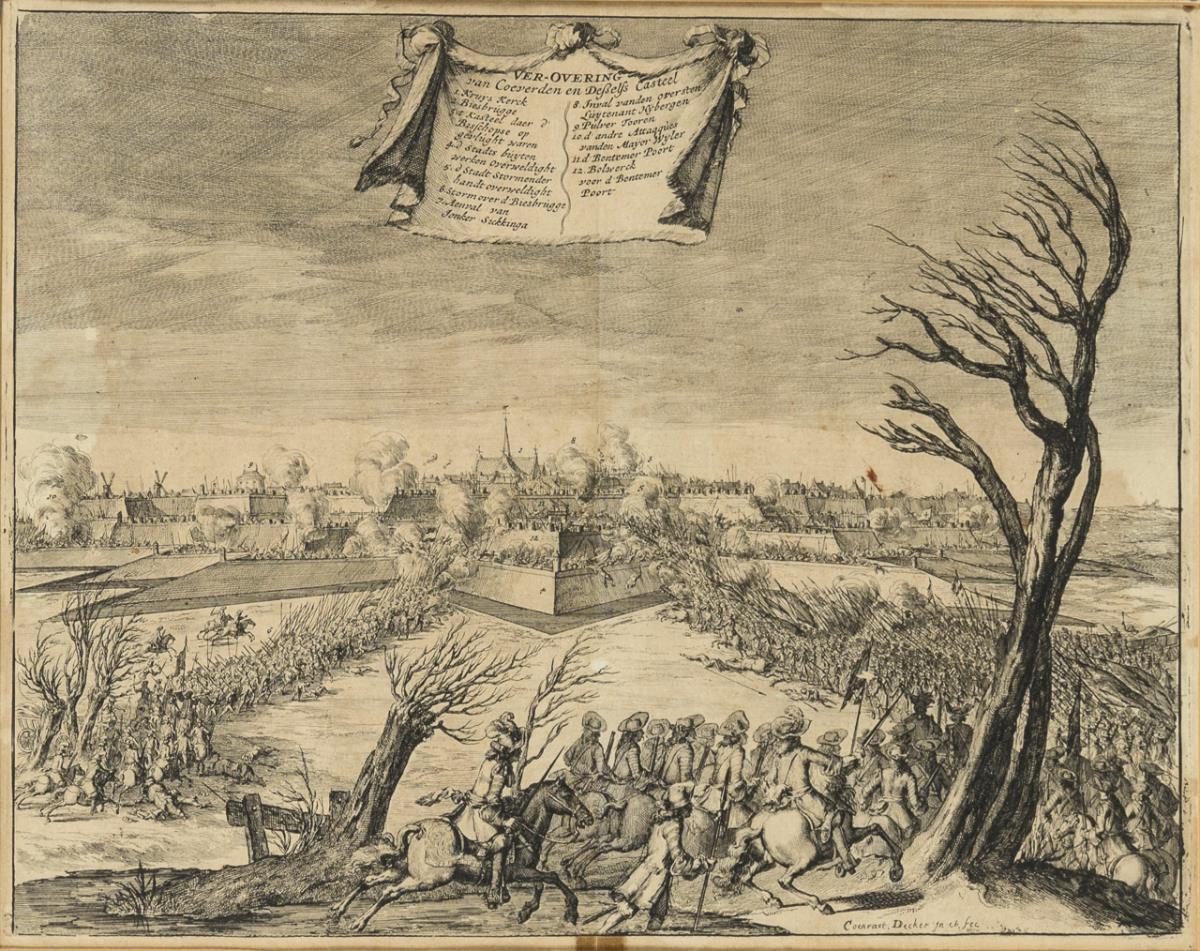 View of an army in a barren landscape storming the town of Coeverden in the Netherlands, presumably during the Dutch War of 1672. Slightly stained, traces of adhesive at lower center.