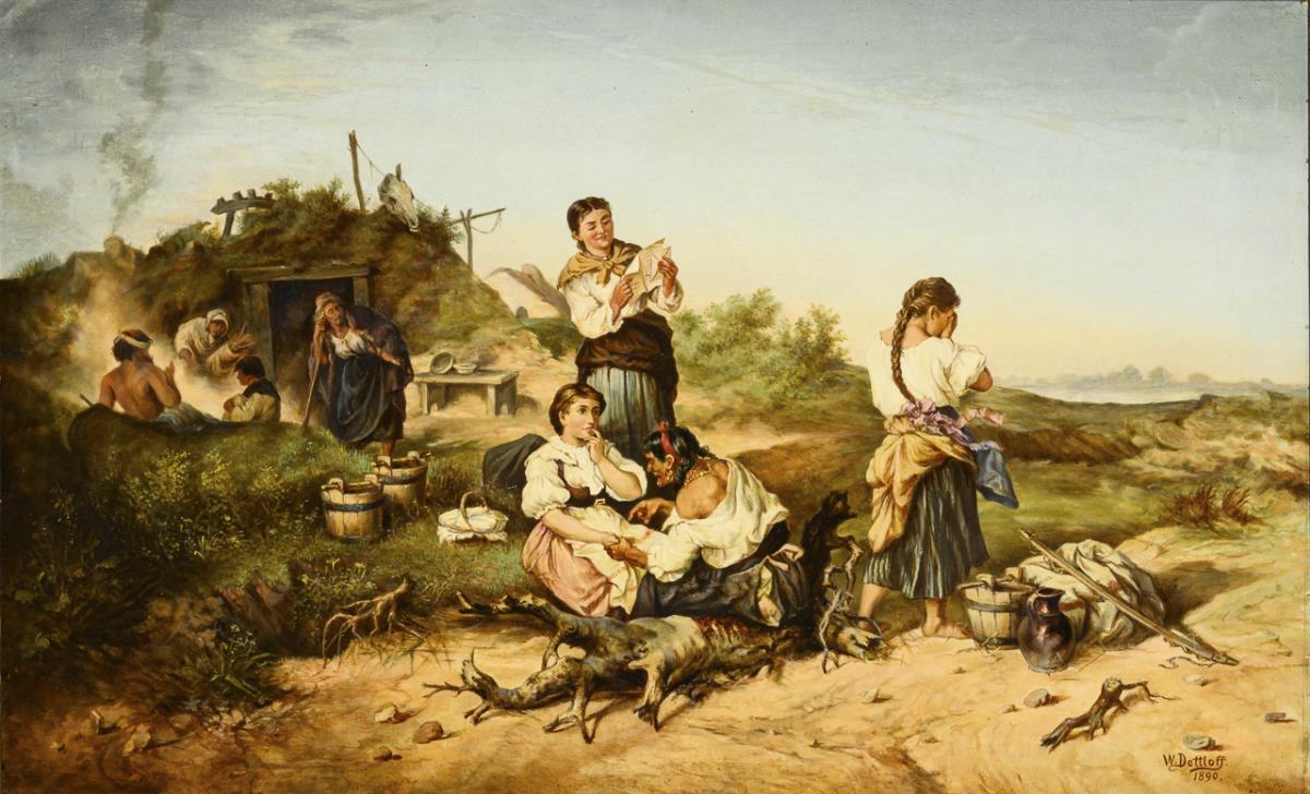 The women on sandy ground in a wide landscape near a river in the sunshine.