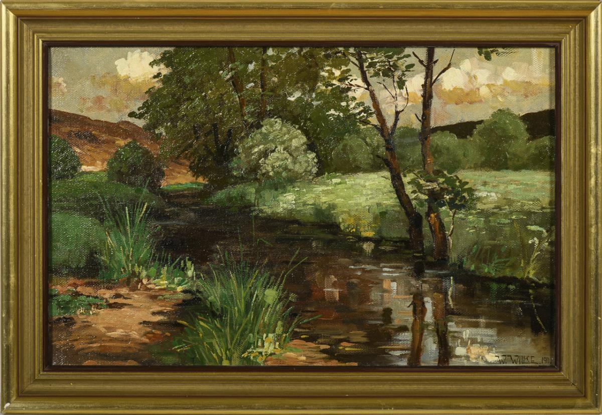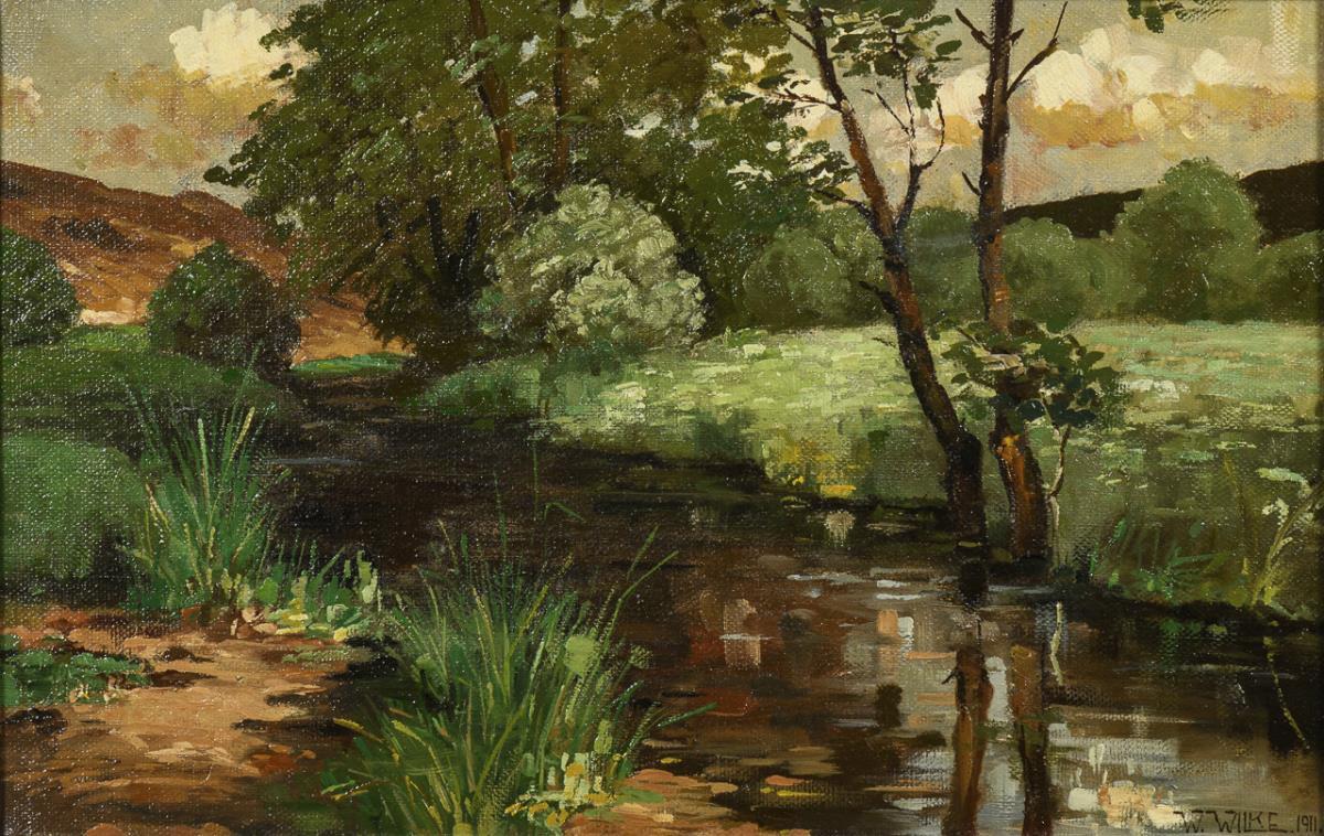 Shallow water in front of a green meadow bank in a mountainous area. A small restored area.