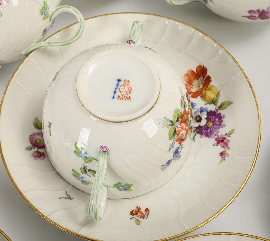 Polychrome painted, decorated in gold. 12 soup cups (H 5.5 cm), 12 saucers (Ø 16 cm).
