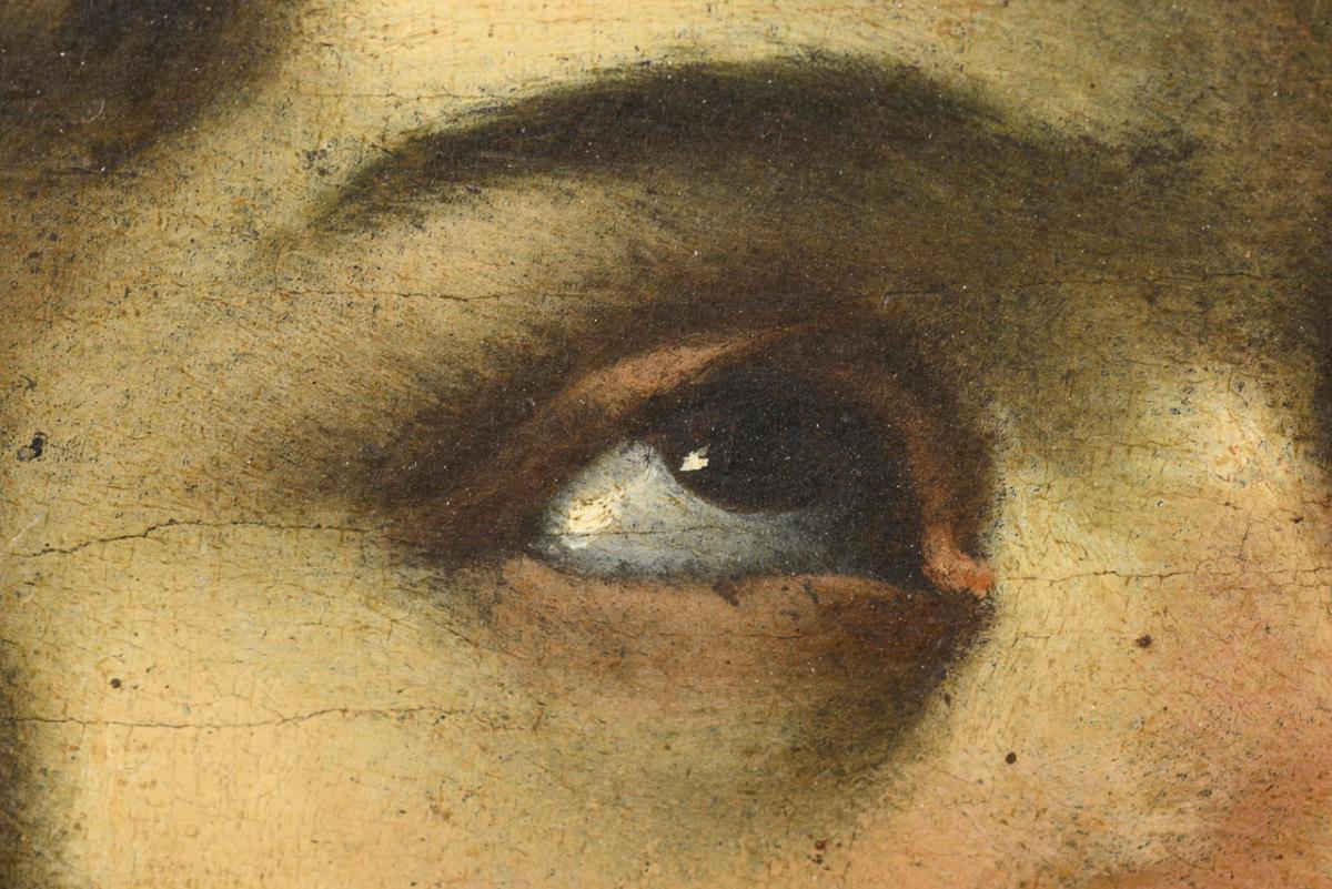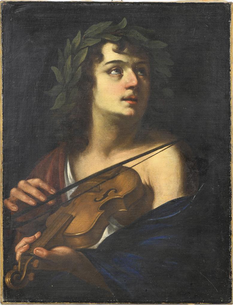 Young man with a laurel wreath over his curly hair playing the instrument. Doubled canvas.