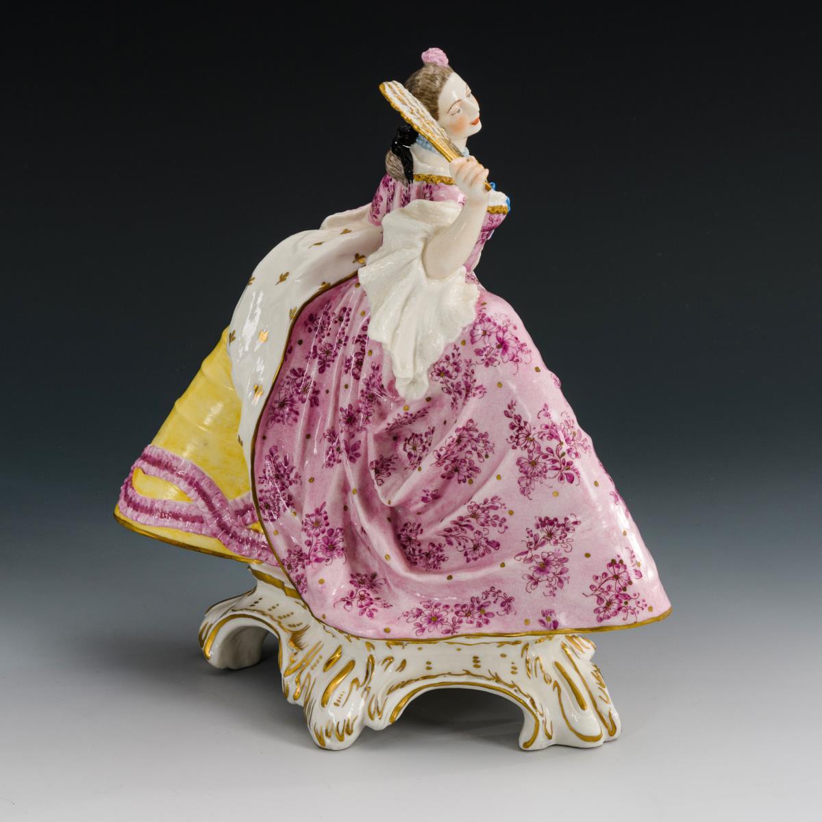 Auf einem Rocaillesockel stehende Rokokodame im Reifrock, einen Fächer haltend.