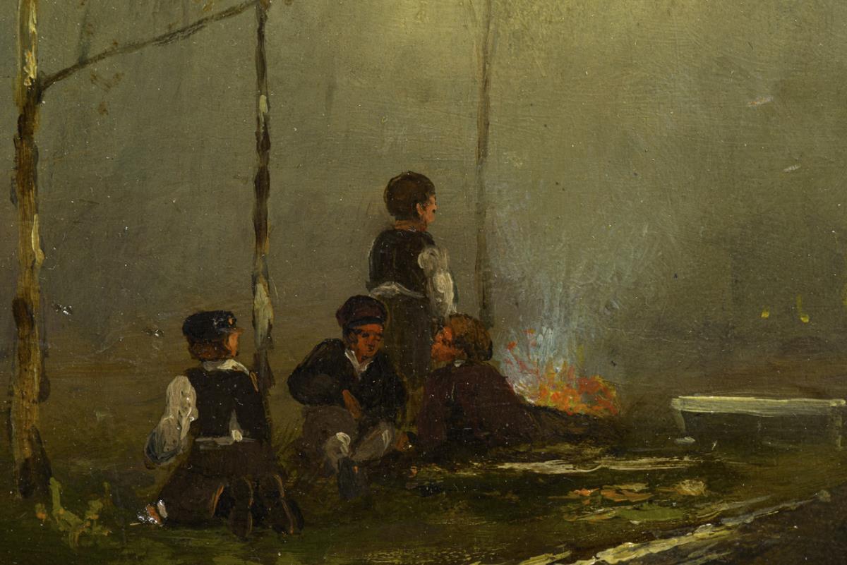 Four boys by the wayside not far from the town at a campfire in foggy weather.