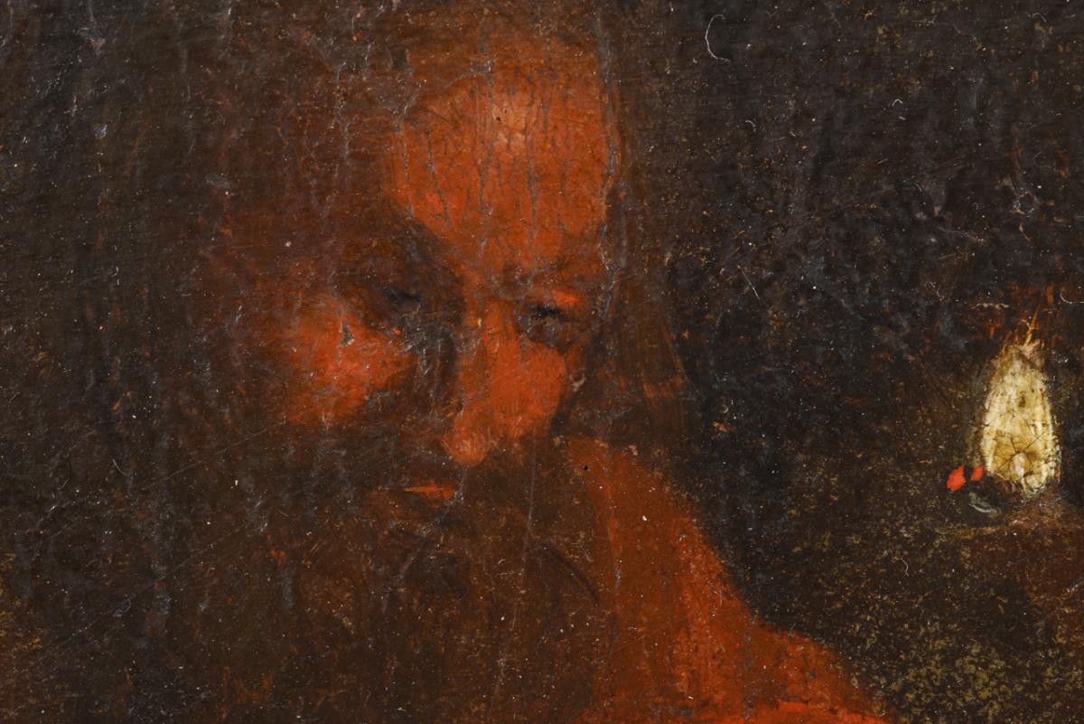 The old man in antique-style robe in semi-darkness in front of the lamp. In need of cleaning.