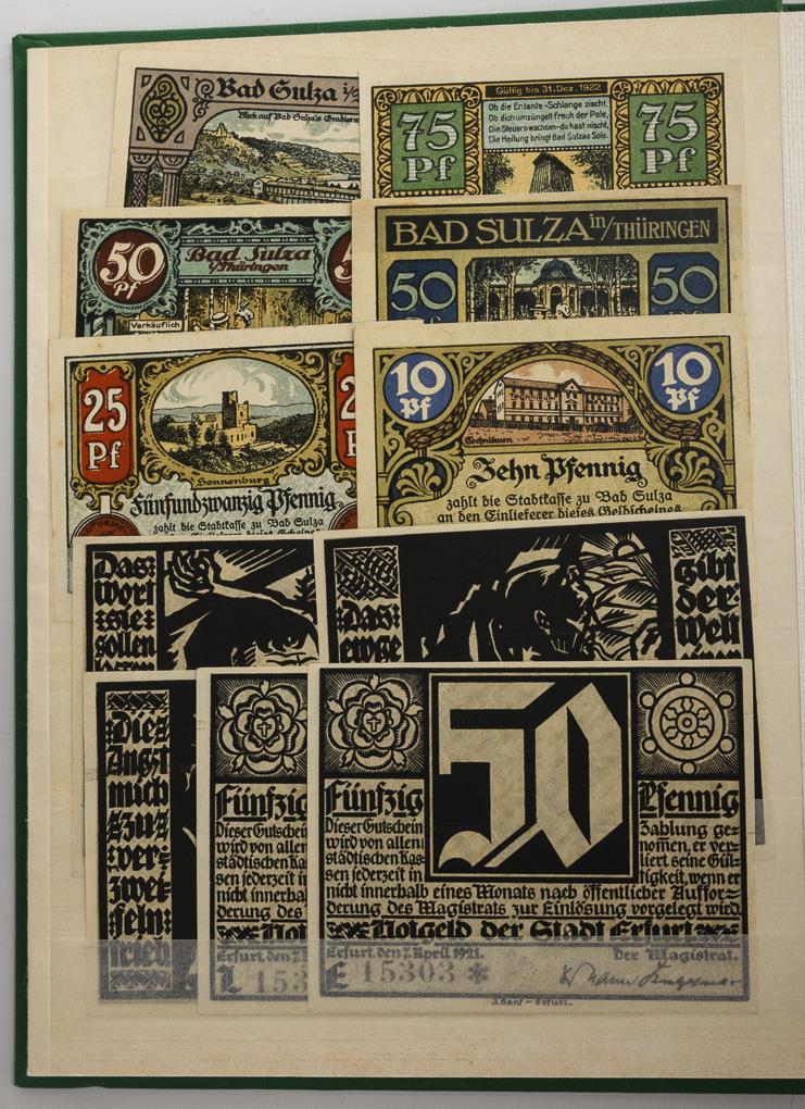 Approx. 1176 bills, mainly Thuringia. Also 4x German colonies in the same design: East Africa, Southwest Africa, Cameroon, South Sea Islands. Occasionally with signature or stamp "Ungiltig". Some signs of age/use, also on the albums.