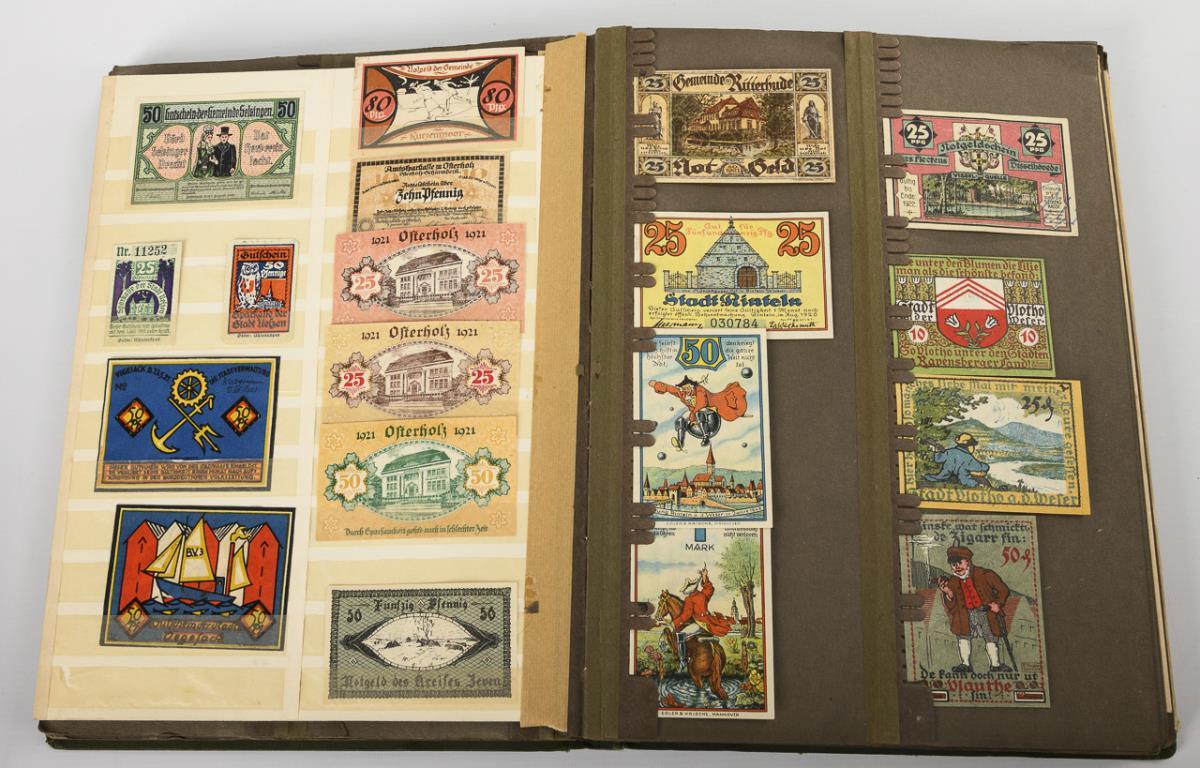 1914 to 1920s. 1 large "Notgeld-Sammelalbum" D.R.G.M., otherwise more recent albums.