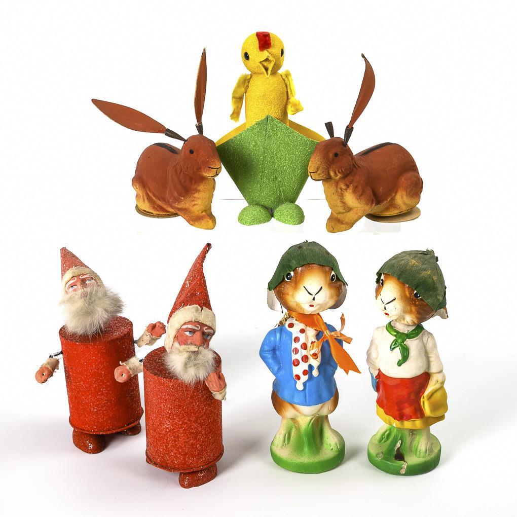 2 Santas and 2 Easter bunnies with bobble heads, plus chicks with semolina decoration and 2 brown bunnies as candy boxes. Parts with signs of age and defects.