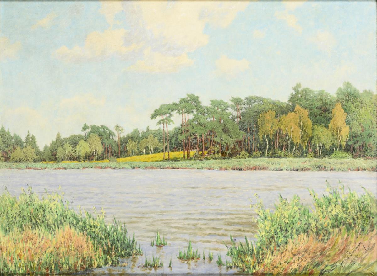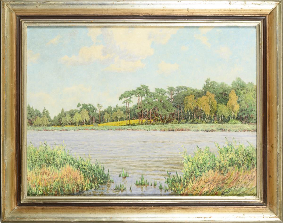 Slightly moving water in front of a birch and pine forest in bright sunshine. Slight traces of age.