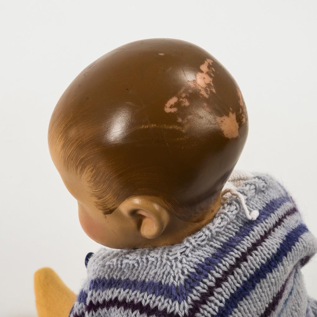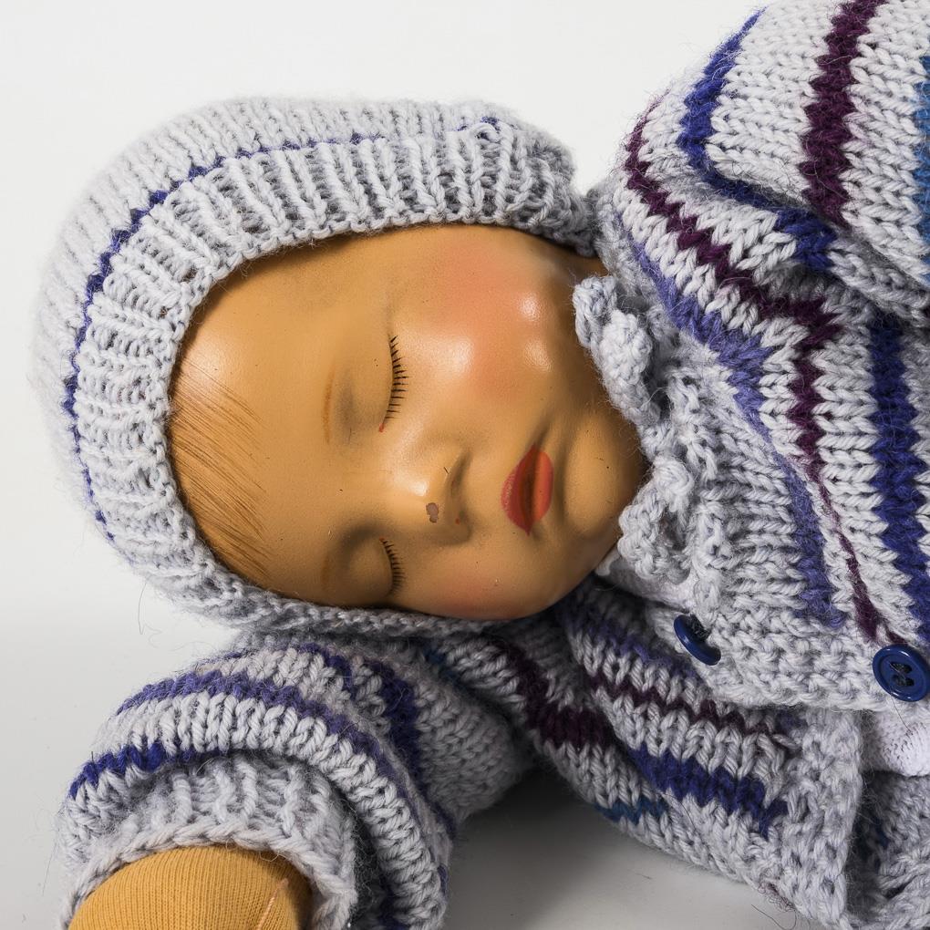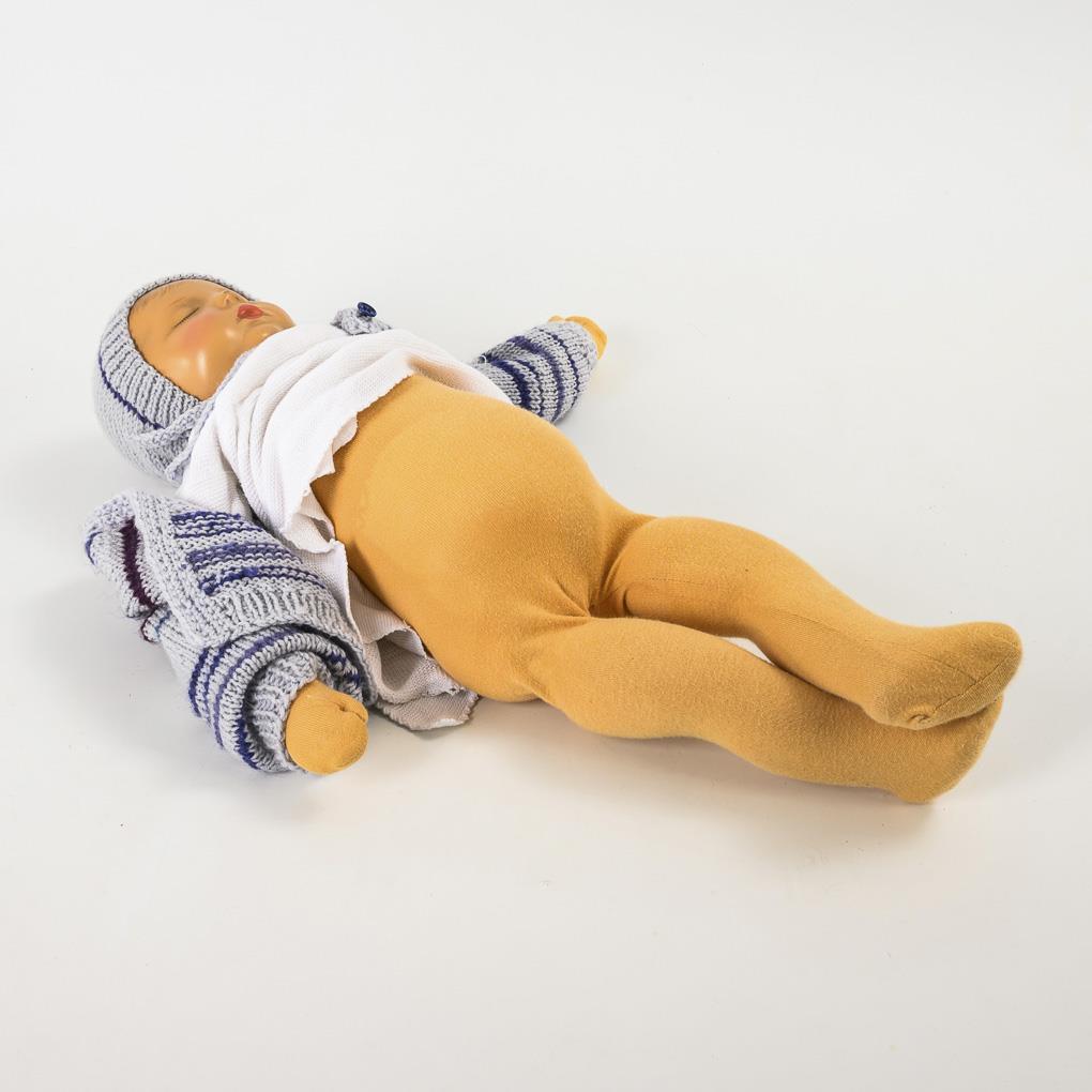 Type Vs, weighted version. Sleeping baby with plastic head, fabric body without navel and pole hole. White baby shirt, striped cardigan. Nose tip and head rubbed.