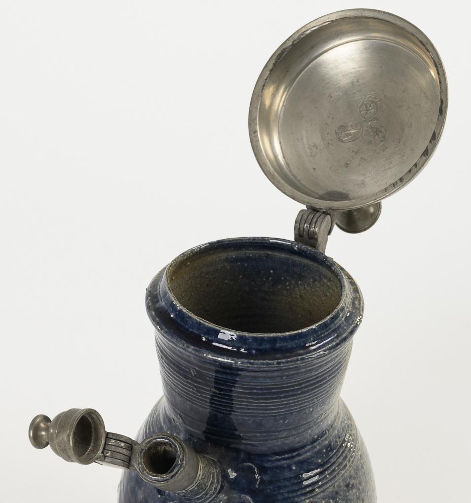 Ovoid body with slightly flared cylindrical neck and indented lip, strap handle with thumbprint, slender, cylindrical spout with a rosette wreath of regular fingerprints. Neck, shoulder and spout with horizontal groove decoration. Pewter lid with ball pusher, punched inside, spout attachment and pewter stand ring.