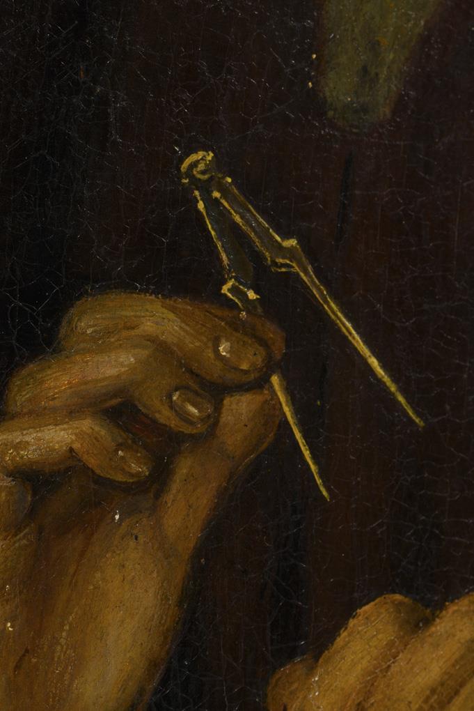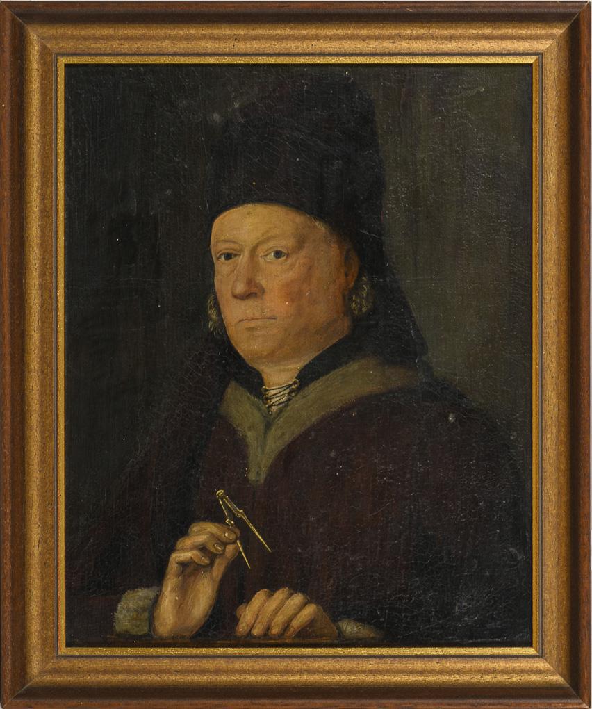 Portrait of a man with a compass and against a neutral background. Signs of age.