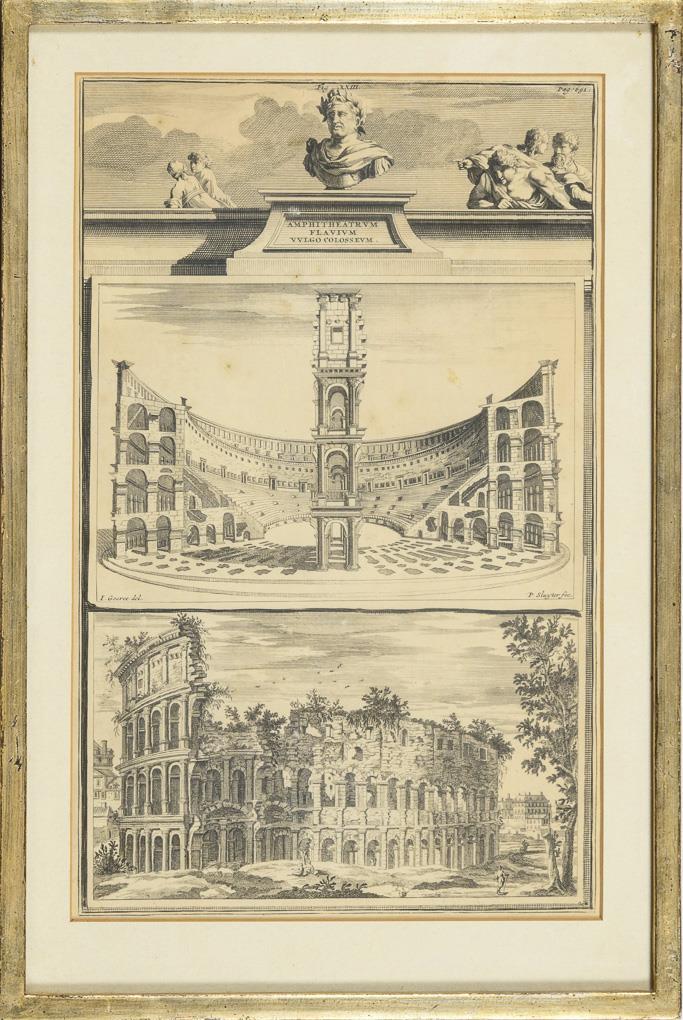 Copper engraving with two views of the ruins of the Colosseum amphitheater in Rome, an elevation of the building in an intact state and a view of the overgrown ruins from the outside.