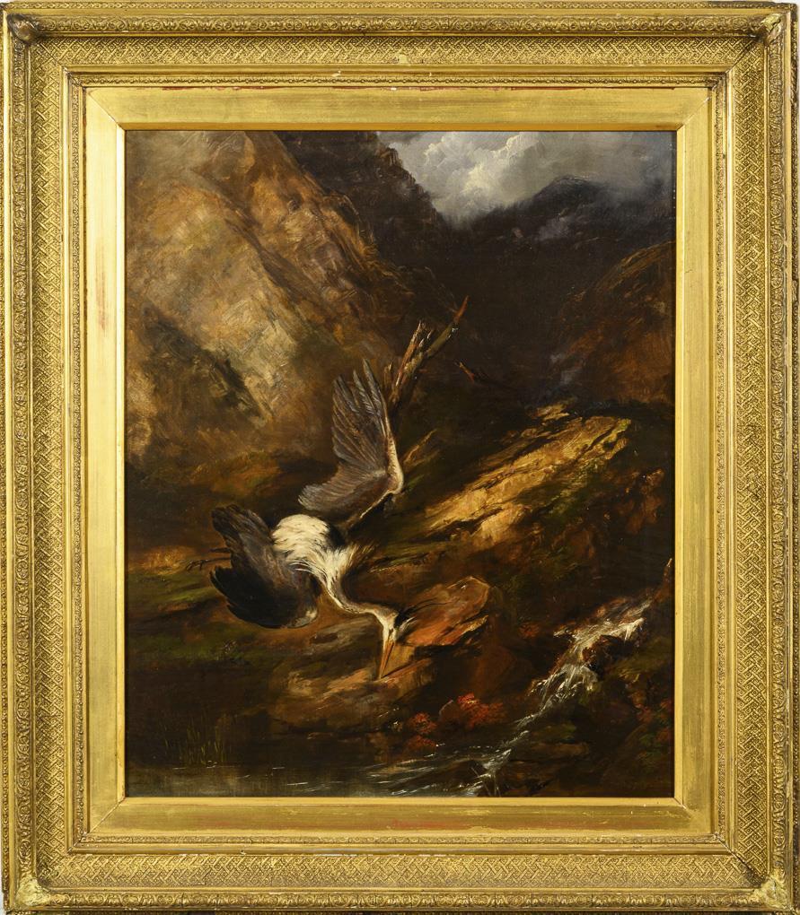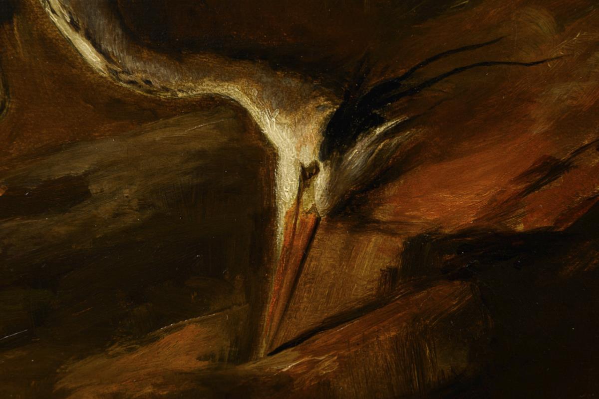 The shot bird with bleeding wound on a rock by a body of water. Doubled canvas.