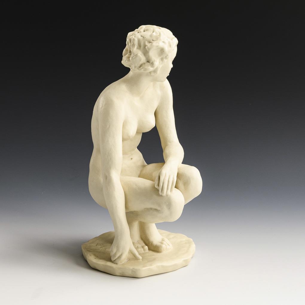 Squatting female nude supporting herself with one hand.