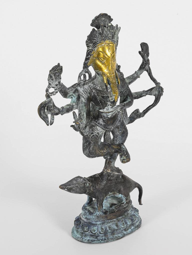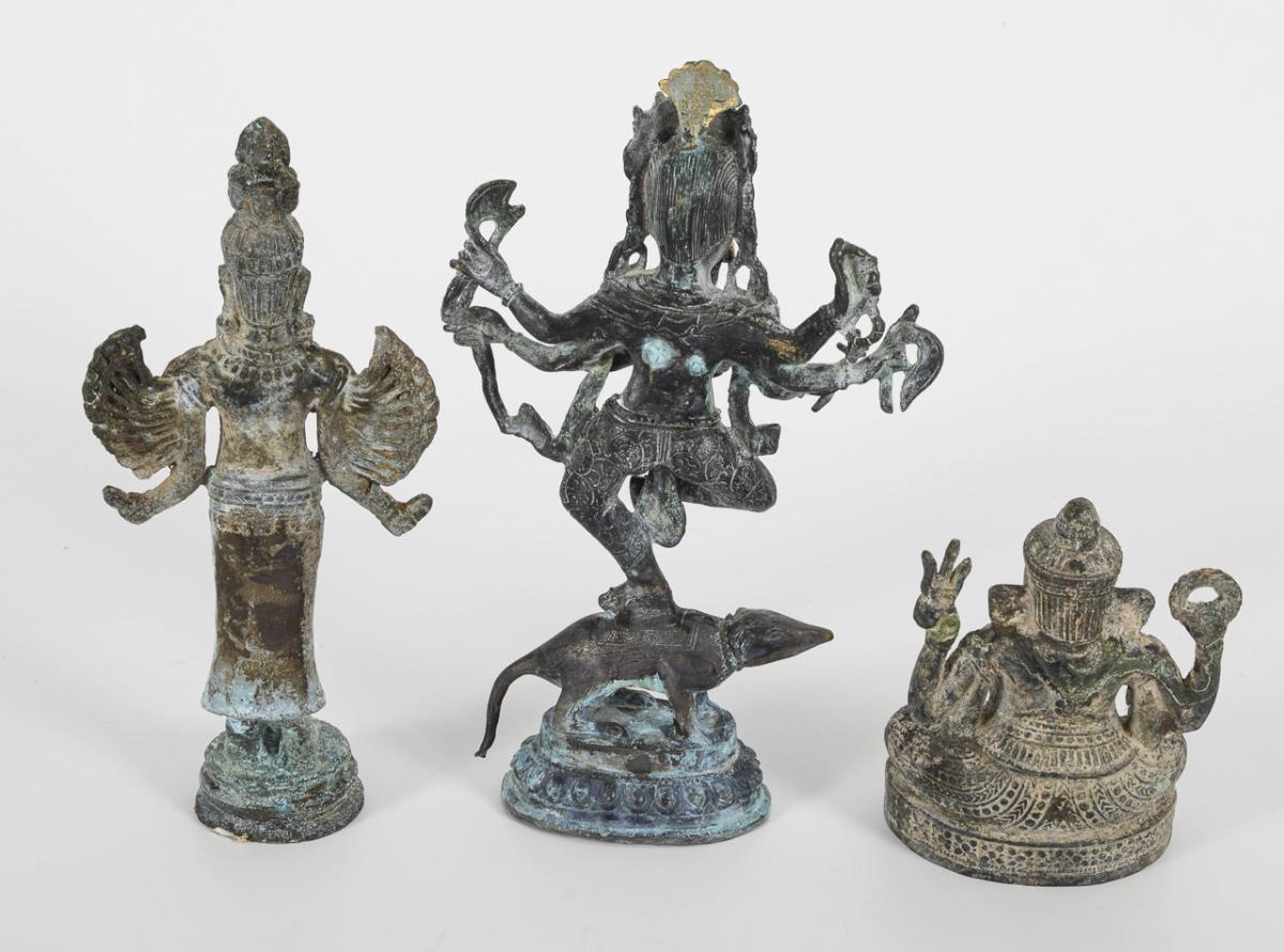 Auf Ratte tanzender, vielarmiger Krishna. / Vierarmiger, sitzender Krishna. / Stehende Frauenfigur, die vielen Arme wirken wie Flügel. Mit weisslicher Patina bedeckt.