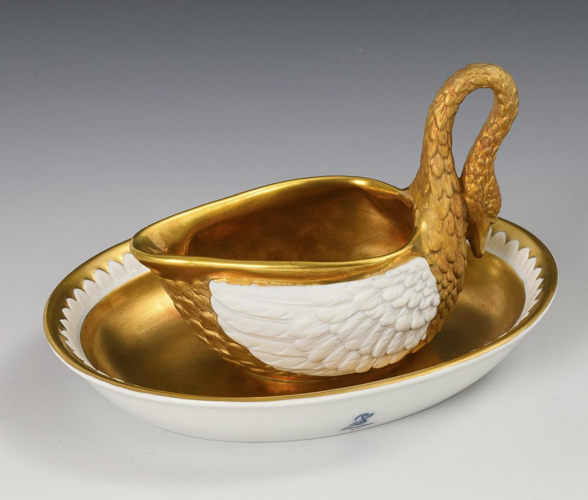 White, partly bisque, decorated with gold. Pourer (h 8.5 cm), saucer (l 15.5 cm).