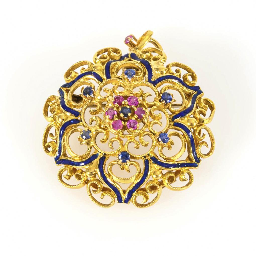 Pendant/brooch with rubies and sapphires.