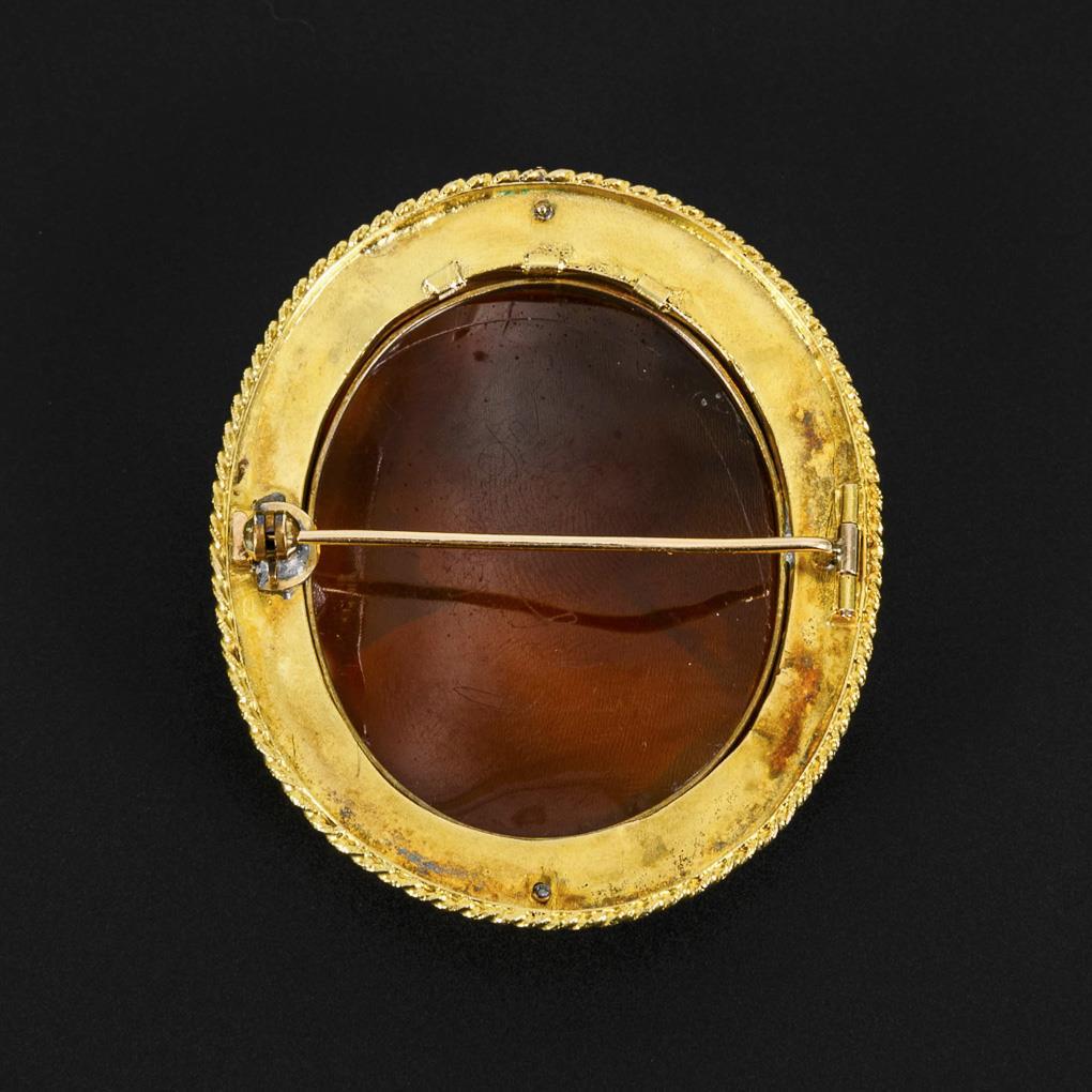 Bezel-set cameo with antique-style cut profile head of the moon goddess Luna in a decorated frame with 6 seed pearls. Supplemented ball hook.