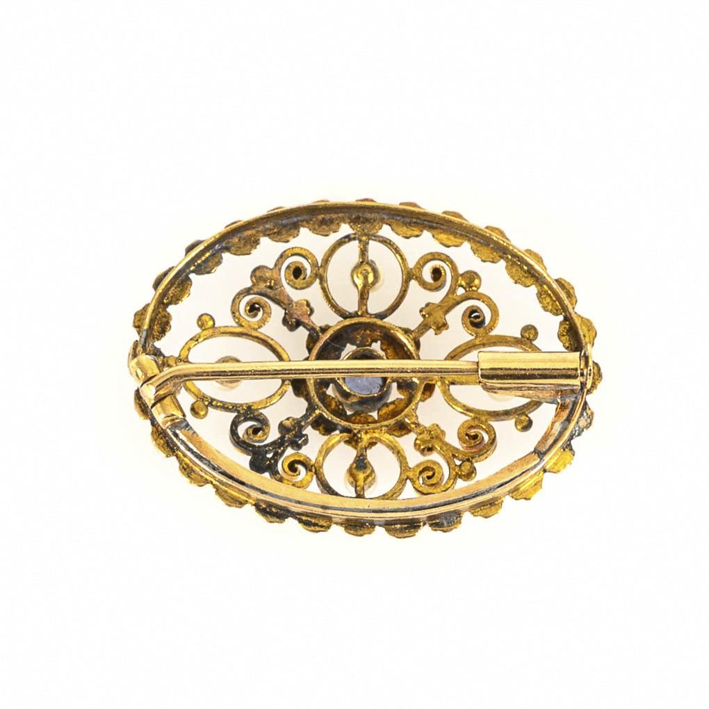 Filigree ornamental brooch with bezel-set, small sapphire and 4 natural pearls. Sliding hook. Finished brooch.