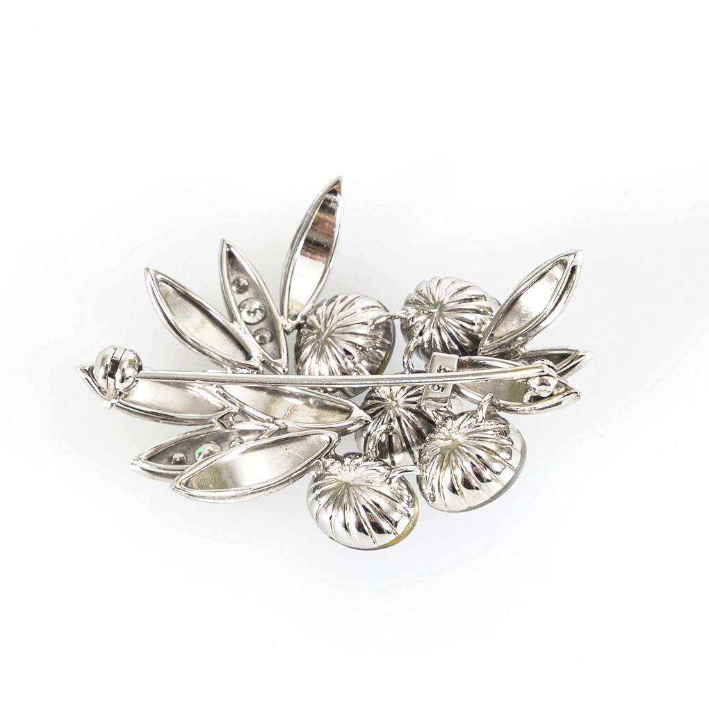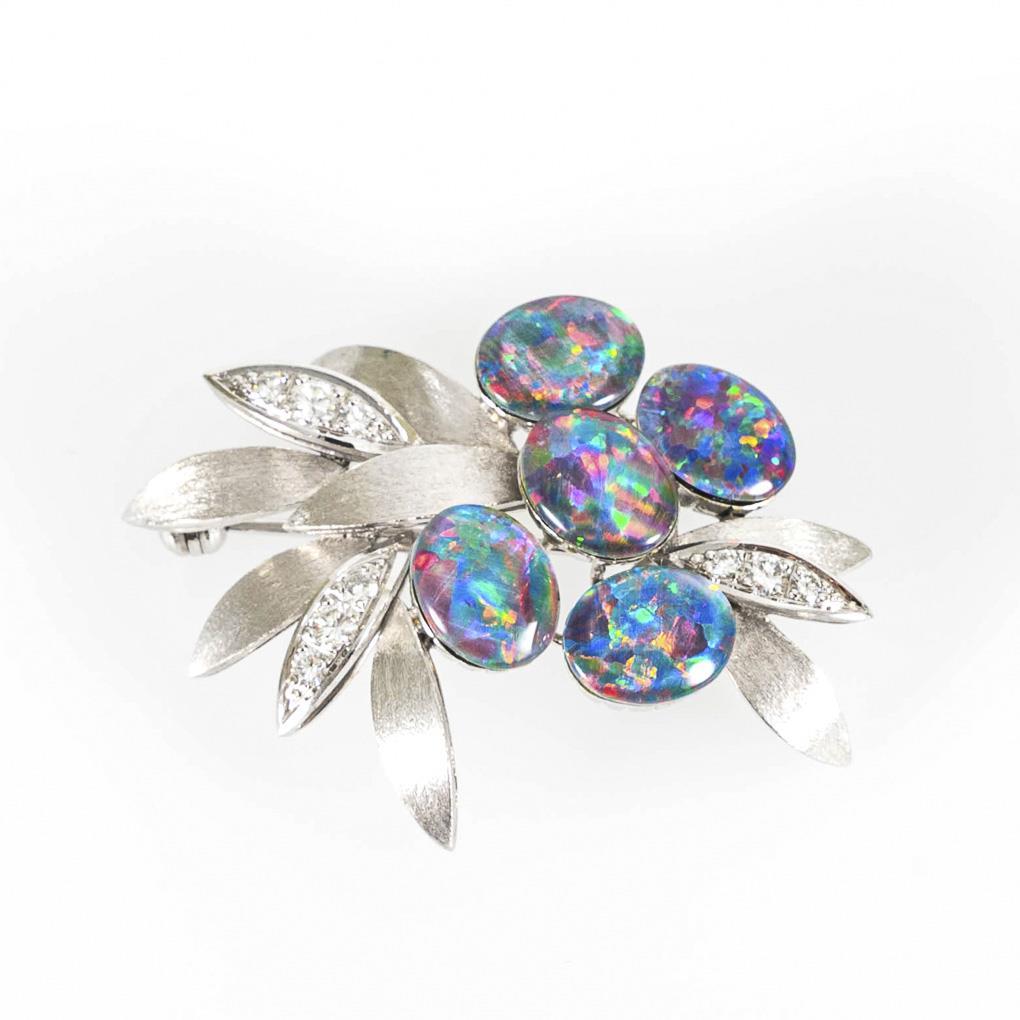Stylized flower brooch with 5 bezel-set opal cabochons and 9 embedded brilliant-cut diamonds between satin-finished foliage. Ball hook.