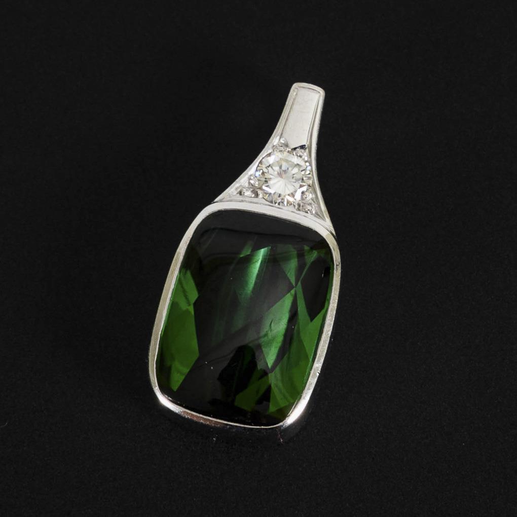 Stamped white gold 585. Tourmaline 15.25 x 11.5 x 6.0 mm. Approx. 7.50 ct. Brilliant approx. 0.25 ct/white/high clarity. Pendant 2.5 x 1.3 cm. 5,7 g.