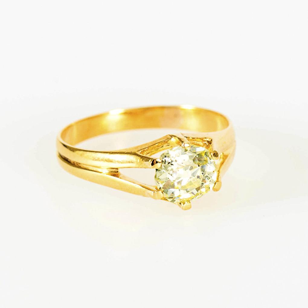 Certified 750 yellow gold. Diamond 1.061 ct (set and weighed). Slightly yellowish/PII. Ring size 55.5. 2.4 g.