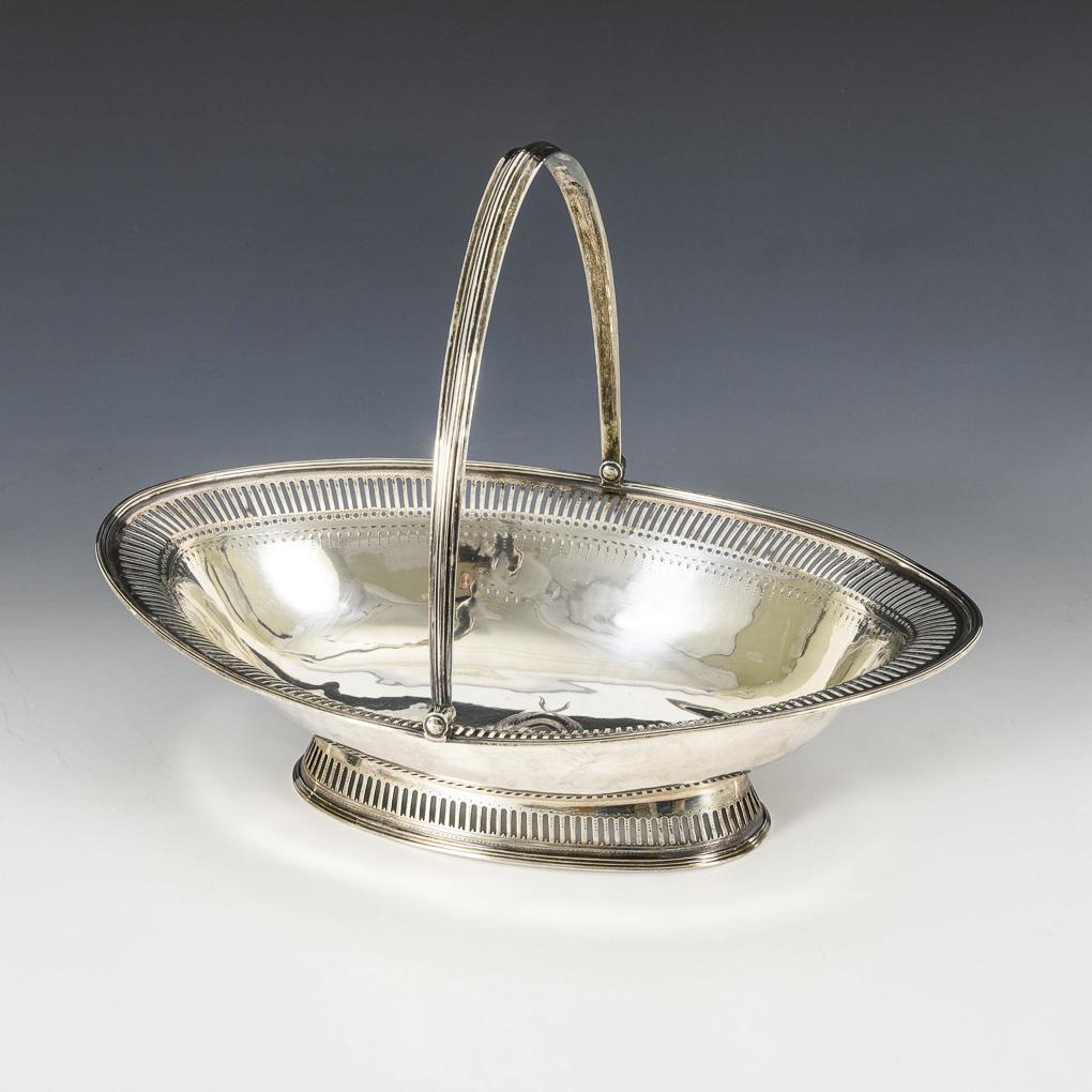 Oval silver bowl with hinged handle and engraved coat of arms medallion in the mirror. Solder marks on the base ring.