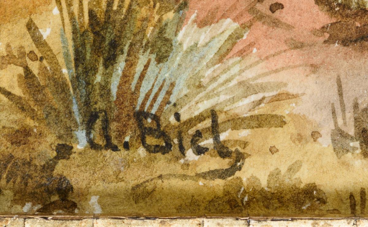 Links unten signiert, rechts unten undeutlicher Schriftzug.
