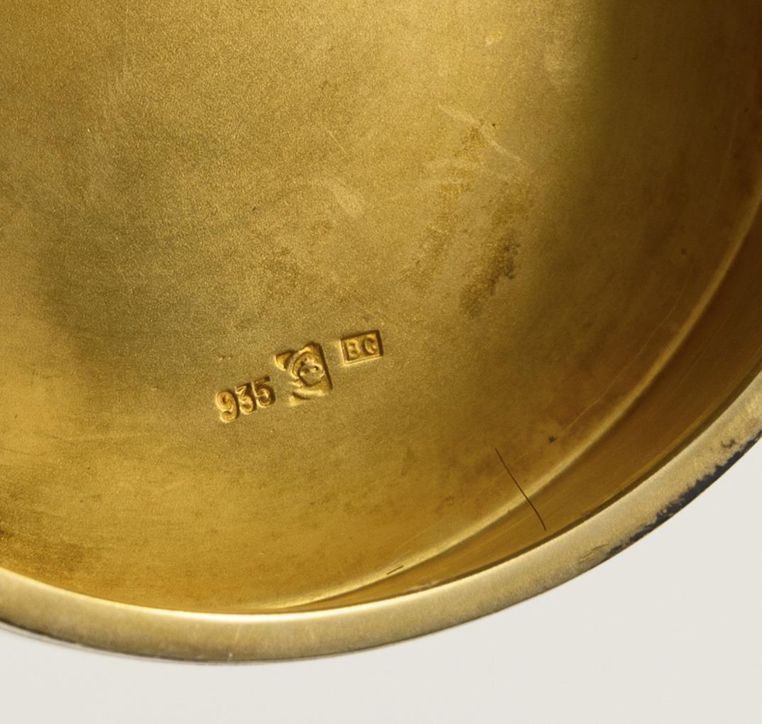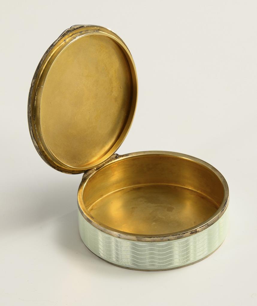 Silver gilt inside, translucent lime green enamel over guilloche, enamel painting. H 2 cm, Ø 6 cm. 72 g.