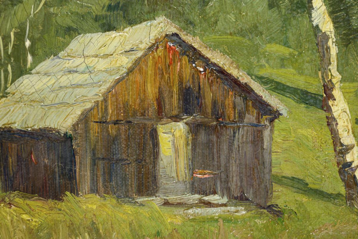 Small hut on a meadow between birch trees in front of the forest below the mountain range. A restored area, canvas doubled at the edges.