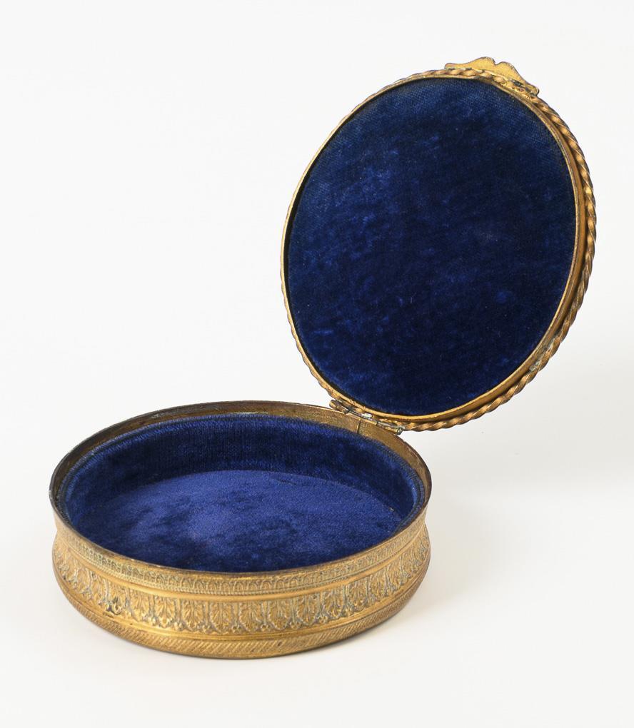 Brass, porcelain plaque with color lithography, blue velvet inside. H 3 x 9.5 cm.