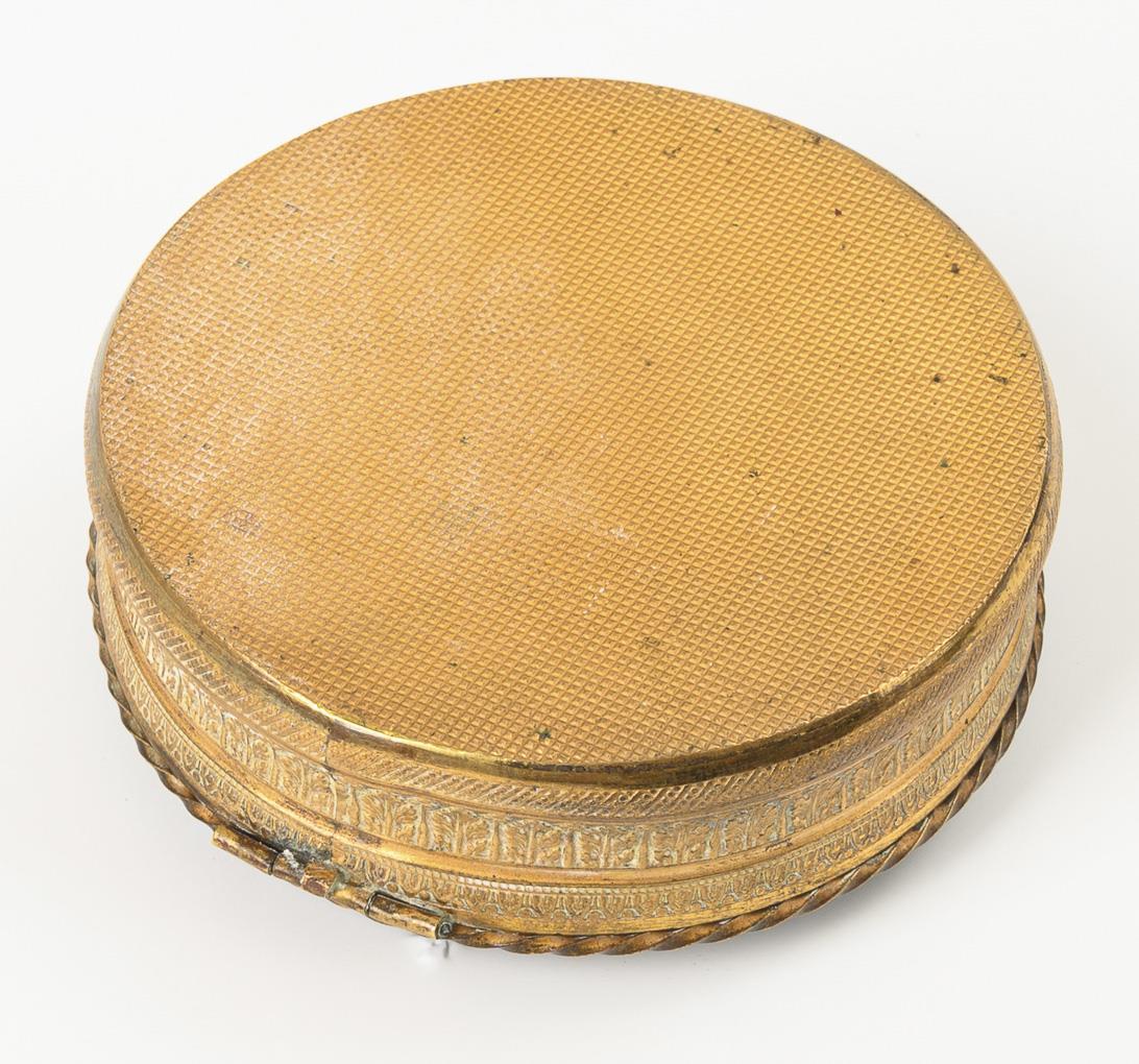 Round box with fine relief; framed tondo on the hinged lid with a beauty in late Baroque style. Minor damage to the plaque.