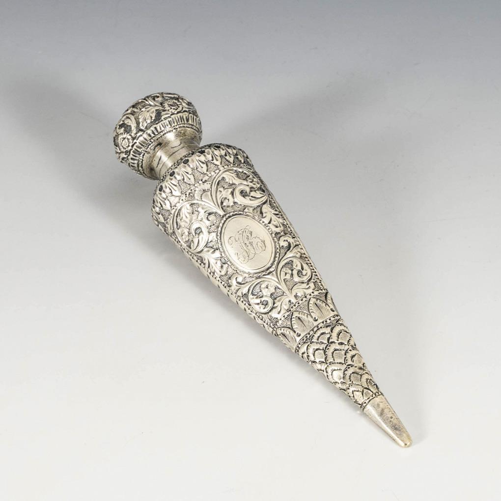 Floral relief flacon in tapered shape, engraved monogram "ICB" on the front. Screw cap with left-hand thread.