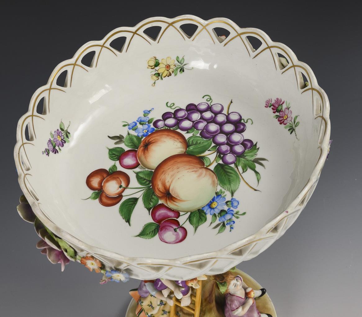 Flower-covered bowl with fruit painting, on an apple tree shaft with three children grouped around the tree harvesting apples. 1 leaf chipped.