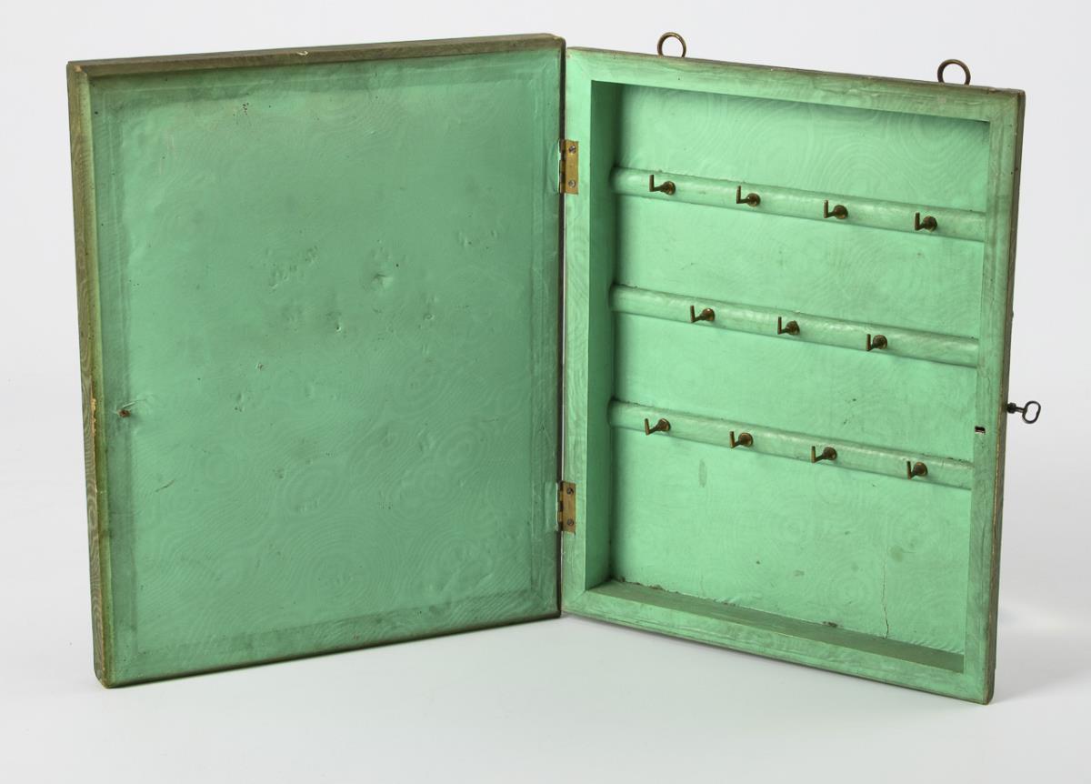 Rectangular box with picture frame door, romantic landscape embroidered under the glass; 11 hooks in the lockable box. Missing areas to the embroidery, signs of age/use.