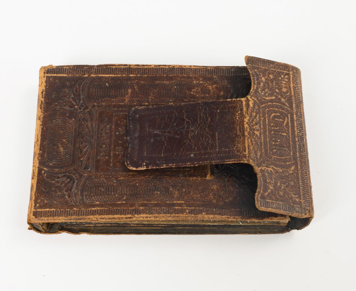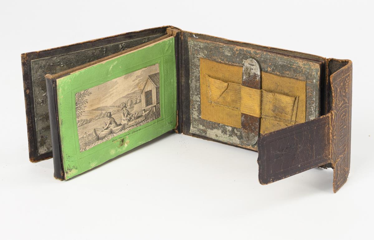 Larger smoker's leather case with embossed ornament, smokers and "Tabak" lettering; inside tinfoil-lined compartments for cigarillos, further compartment and dedication from 1837 in Frankfurt on the lithograph with fishermen. / Spectacle case with ornamental pearl embroidery and monogram "AS". / Small spectacle case with miniature: Resting hunter with dog and hunted game. Signs of age/wear.