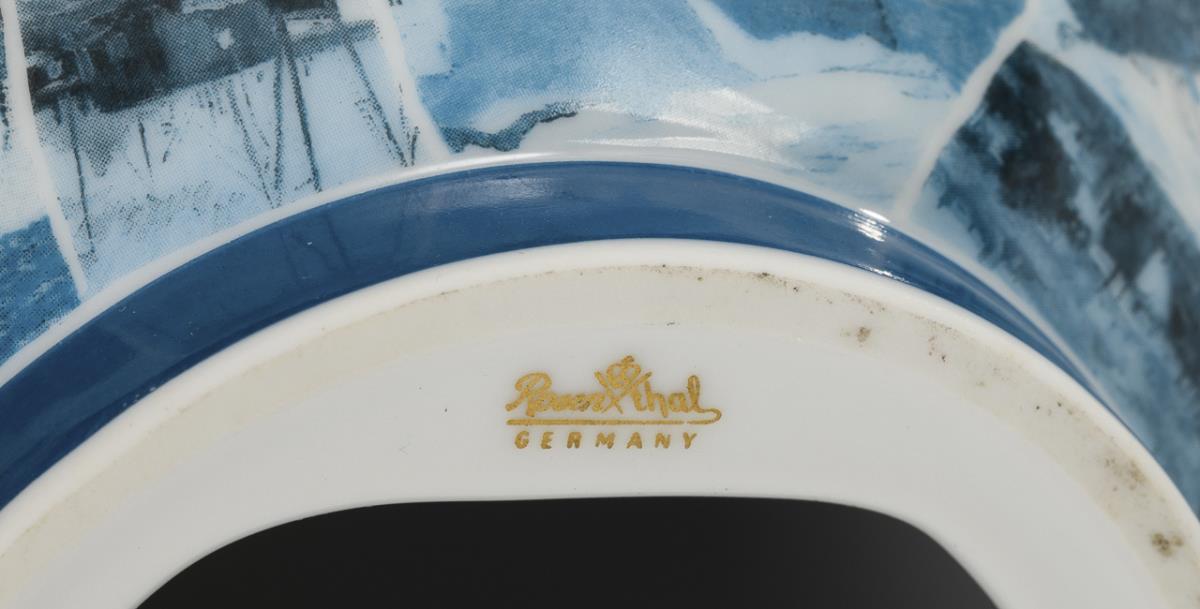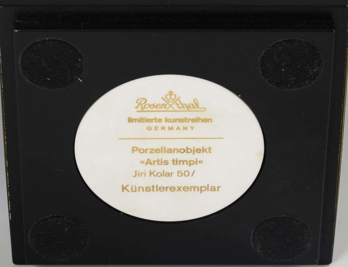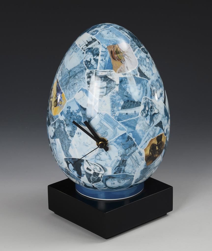 Ogg-shaped clock with two battery-operated movements, on a wooden base. The wall is decorated with a polychrome collage-like arrangement of picture details of works of art. A porcelain plaque with manufacturer's mark and the inscription "Porzellanobjekt 'Artis timpi' (sic!) / Jiri Kolar 50/ Künstlerexemplar" in the base of the wooden plinth. Clocks running. Hands partly minimally bent.