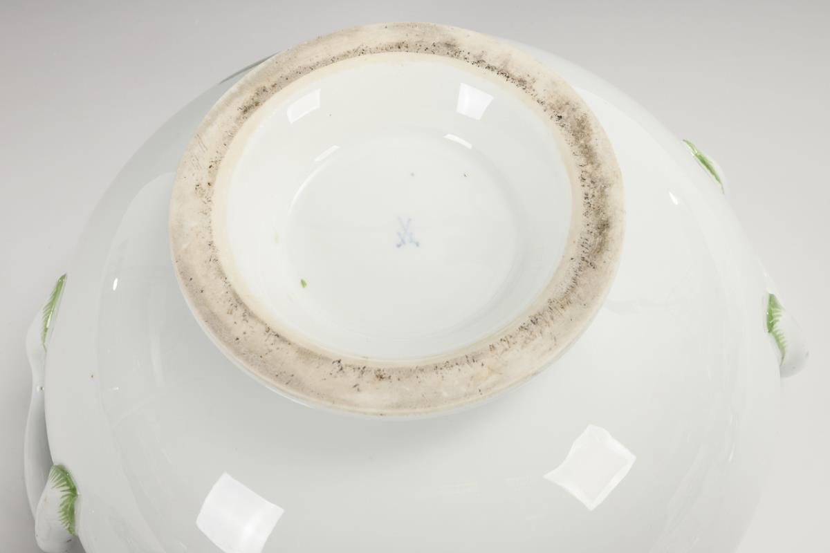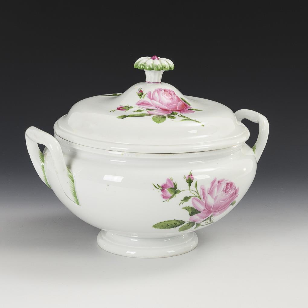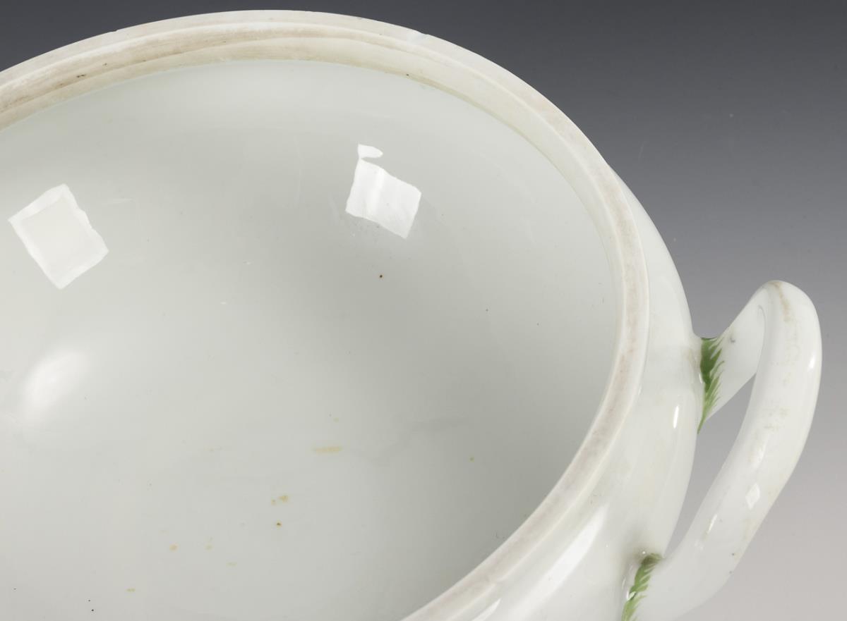 Pressed tureen with two handles and rosette finial lid. 3 rim chips.