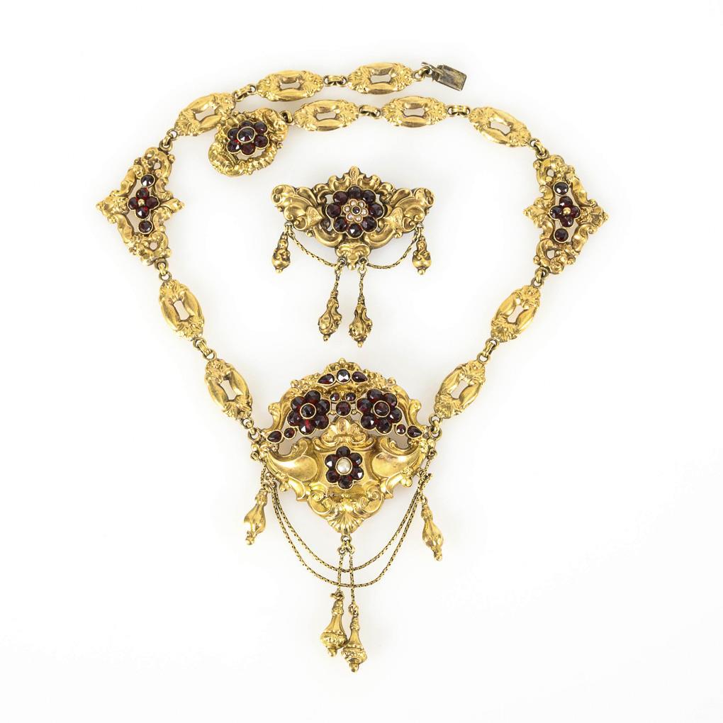 Show piece in hollow form in relief with garnet setting, pampel and chain suspensions between ornamental link chain and box lock, partly with garnet setting. The backs are paved. Matching brooch. Collier: very good condition. Brooch: replaced hook glued, pin hinge reinforced.