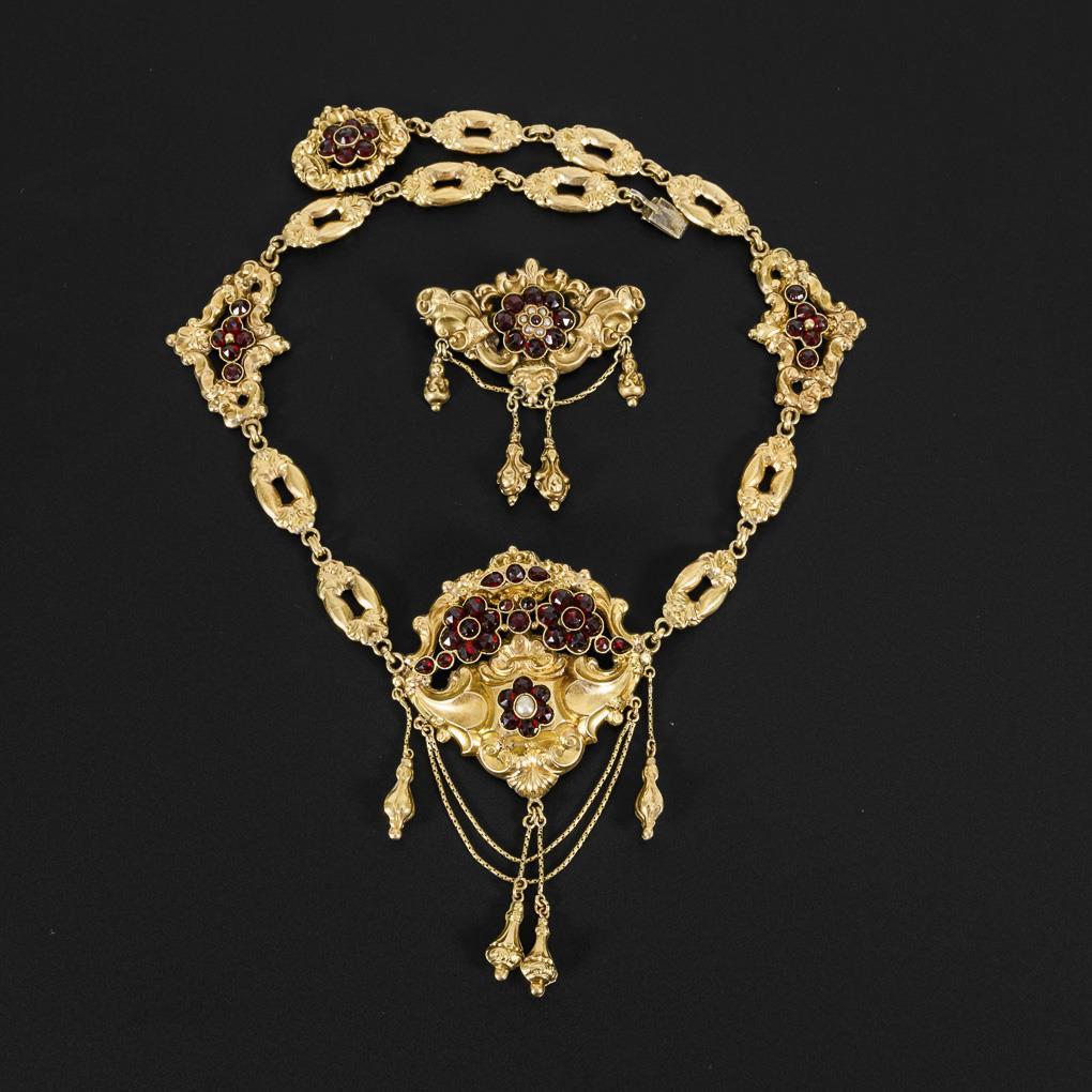 Large Biedermeier necklace and brooch with garnets.