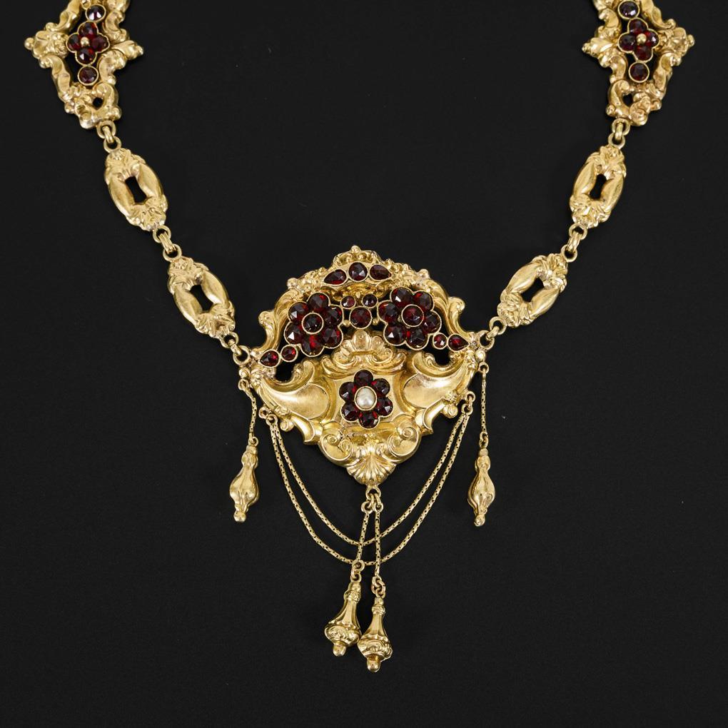 Show piece in hollow form in relief with garnet setting, pampel and chain suspensions between ornamental link chain and box lock, partly with garnet setting. The backs are paved. Matching brooch. Collier: very good condition. Brooch: replaced hook glued, pin hinge reinforced.