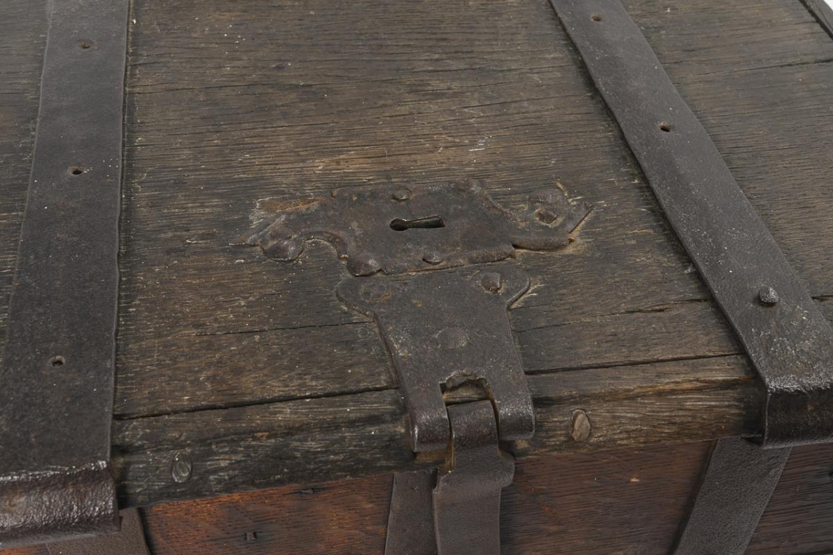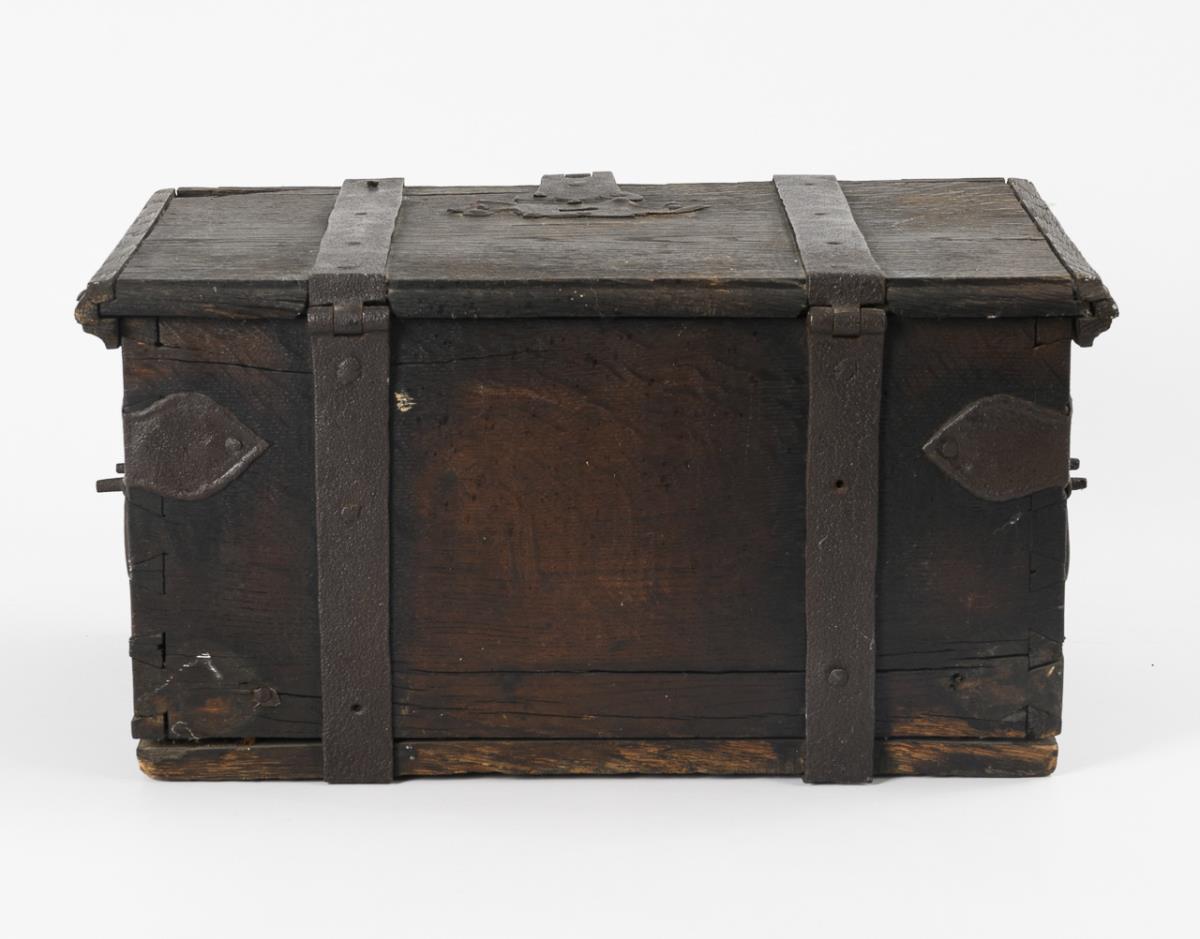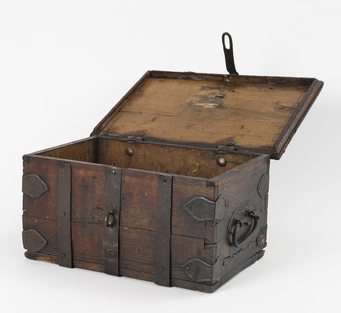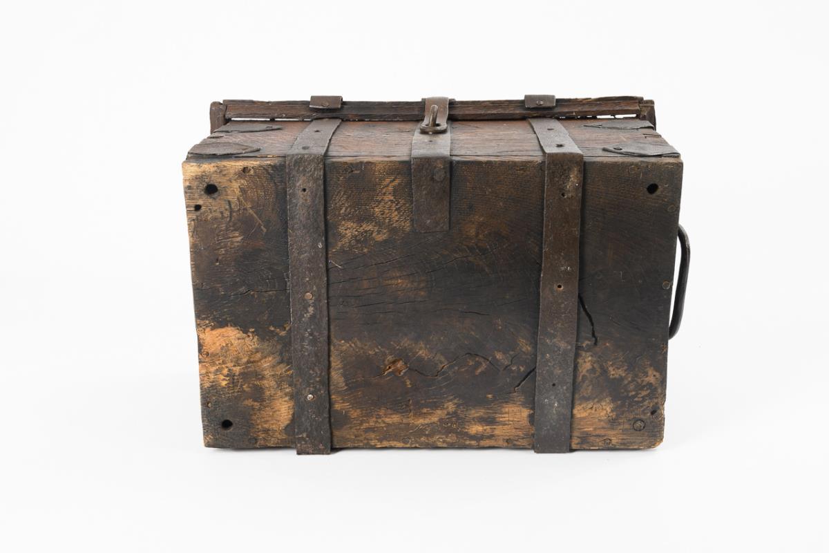 Ashlar chest with hasp for a padlock and keyhole on the hinged lid. Iron straps and leaf-shaped corner fittings as well as carrying handles on the sides. Some dry cracks and missing parts, lock missing.
