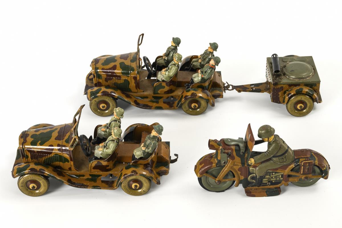 2 crew cars with mass figures (1 figure missing), 1 field kitchen trailer and 1 motorcycle with driver. Signs of age, minor defects. Spring mechanisms of the cars intact, without key. Motorcycle with defective (hardened) rubber tires, does not drive.